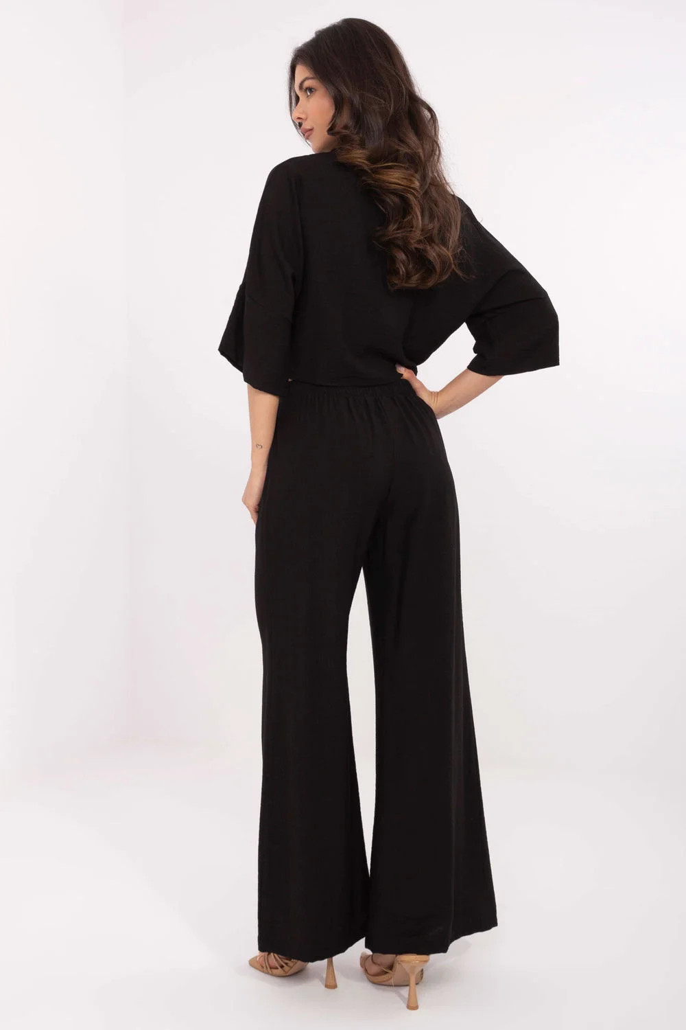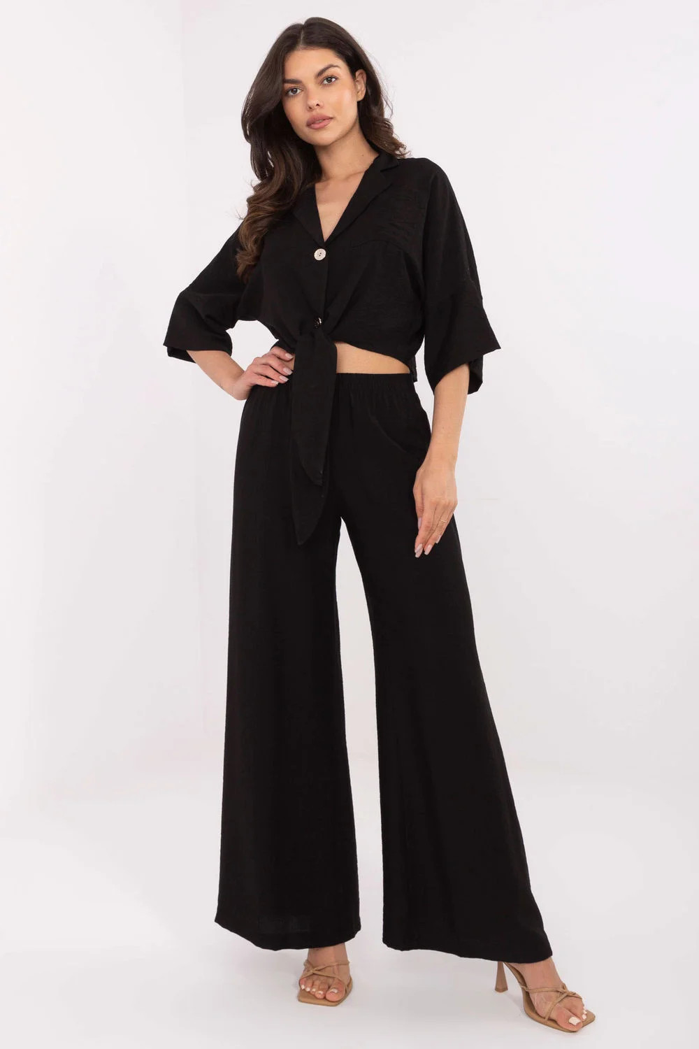 Elegantní a pohodlný dámský set, ideální na každý den. Vyrobený z prodyšné směsi viskózy a nylonu, poskytuje pohodlí a lehkost, ideální na teplejší dny. Košile s knoflíky je vybavena šňůrkou ve spodní části, která umožňuje nastavení délky a přidává celku volného charakteru. V pase je elastický pásek, který zdůrazňuje pas a zajišťuje perfektní přizpůsobení. Košile má klasický límec, 3/4 rukávy a kapsu na hrudi, kombinuje volný styl s funkčností. Kalhoty s vysokým pasem mají široké nohavice po kotníky, co zaručuje módní vzhled a volnost pohybu. Chybějící kapsy v kalhotách dodávají celku čistý, minimalistický vzhled. Dominantní hladký vzor a střízlivý styl zajišťují, že set se skvěle hodí do každodenních stylizací, jak do práce, tak na volnější výlety.