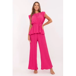 Elegantní dámský set z plisovaného materiálu je stylovou a moderní volbou pro různé příležitosti, od každodenních vycházek po návštěvy nebo pracovní stylizace. Skládá se z bezrukávové halenky s kulatým výstřihem a kalhot s dlouhými, širokými nohavicemi. Hladká struktura látky a jemný lesk plisovaného polyesteru dodávají celku lehkost a eleganci. Kalhoty s vysokým pasem krásně zdůrazňují pas a přiložený pásek k zavázání umožňuje dodatečně modelovat postavu. Chybějící kapsy zdůrazňují elegantní charakter setu a zajistí hladké dokončení linií boků. Tento set je ideální kombinací pohodlí a elegance, skvělou volbou pro ženy, které oceňují styl s nádechem moderní elegance.