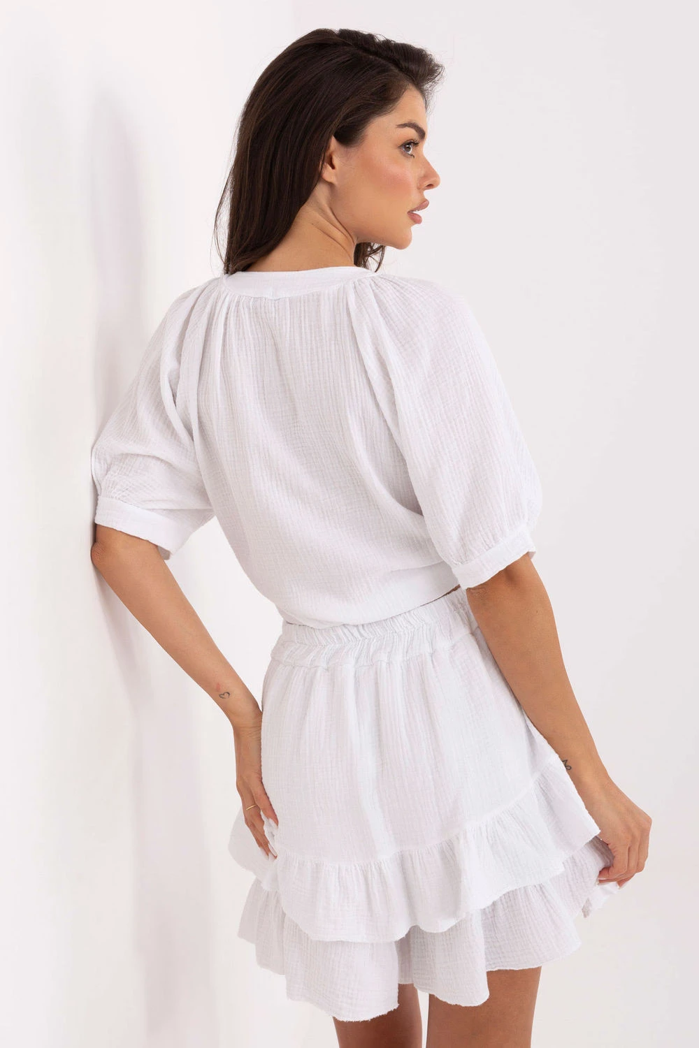 Lehký a prodyšný komplet vyrobený z přírodní bavlny muselínu, ideální na teplé dny. Skládá se z košile zapínající se na knoflíky a šortek s volánky imitující sukně, celkově vytváří soudržný, každodenní casual styl. Košile má volný střih, krátký rukáv a kulatý výstřih, co zajišťuje volnost pohybu a lehkost stylu. Šortky mají široké nohavice a vysoký pas s elastickou gumou v pase, co zaručuje pohodlí nošení a skvělé přizpůsobení postavě. Jemné volánky přidávají dívčí kouzlo a lehkost celému stylu. Hladká struktura materiálu zdůrazňuje přirozený, minimalistický charakter setu, který se skvěle hodí na procházky, nákupy, setkání s přáteli nebo dovolenou. Je to must-have v letní každodenní garderobě.