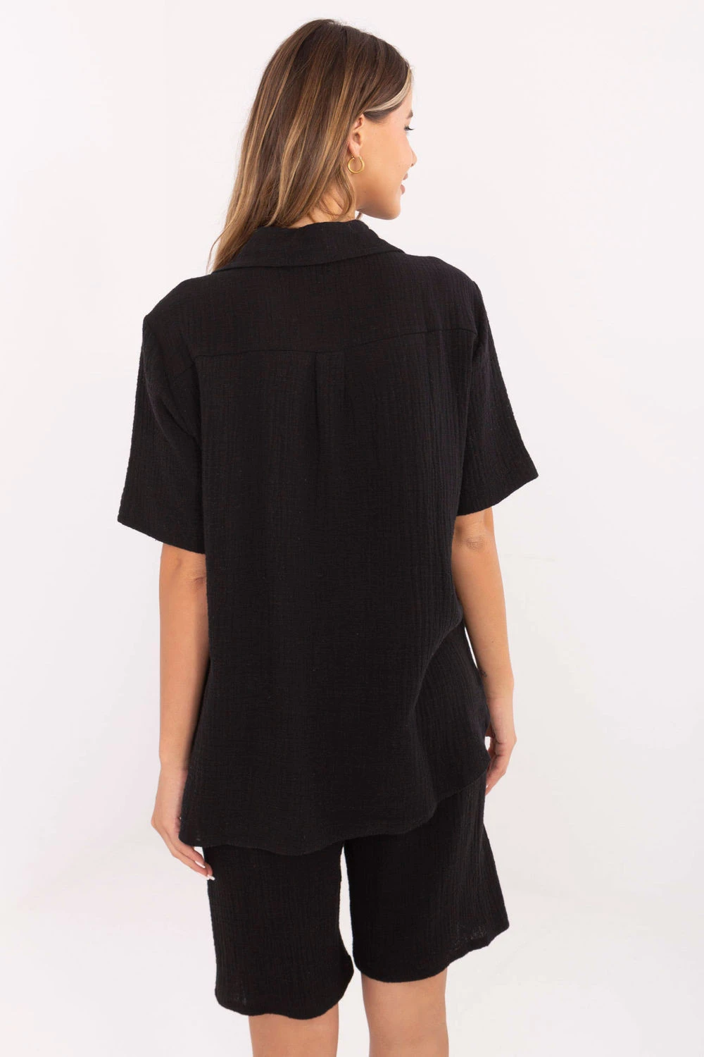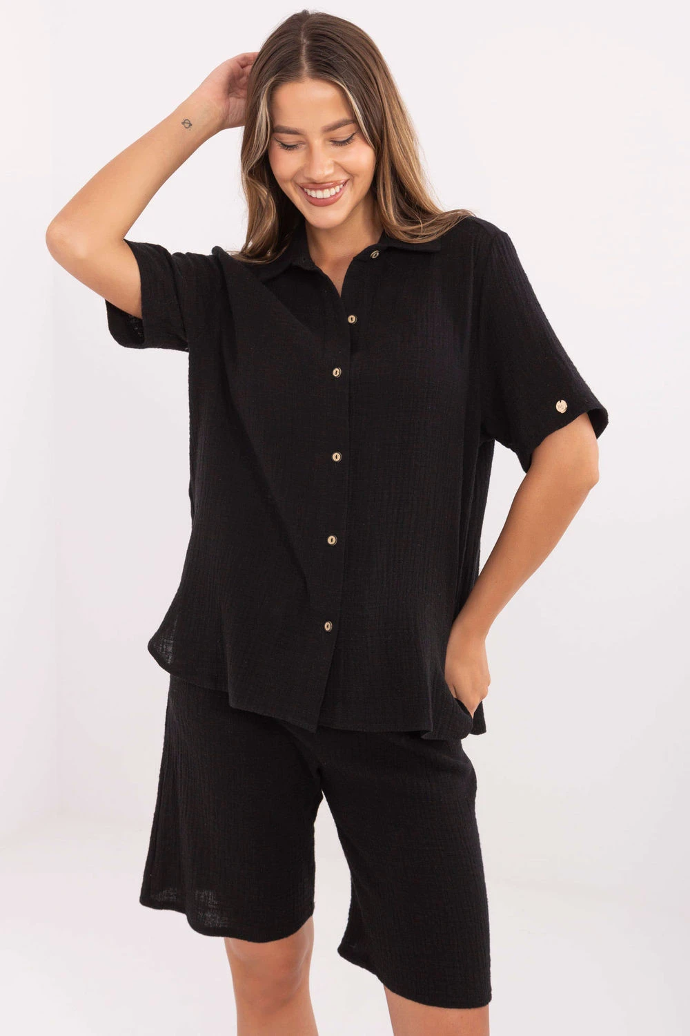 Lehká mušelínová sada skládající se z košile a kraťasů je ideální volbou na teplé každodenní dny. Vyrobená z příjemného a prodyšného bavlněného materiálu poskytuje maximální pohodlí a volnost pohybu. Hladký materiál zdůrazňuje minimalistický, ležérní styl sady. Košile s krátkým rukávem, límečkem a zapínáním na knoflíky vypadá elegantně a moderně, a dodatečný pás na uzavírání umožňuje zdůraznit pas a dodat ženskému tvaru siluetě. Kraťasy s rovnými nohavicemi a vysokým pasem jsou vybaveny praktickými bočními kapsami. Sada se skvěle hodí na každodenní procházky, nákupy nebo setkání s přáteli.