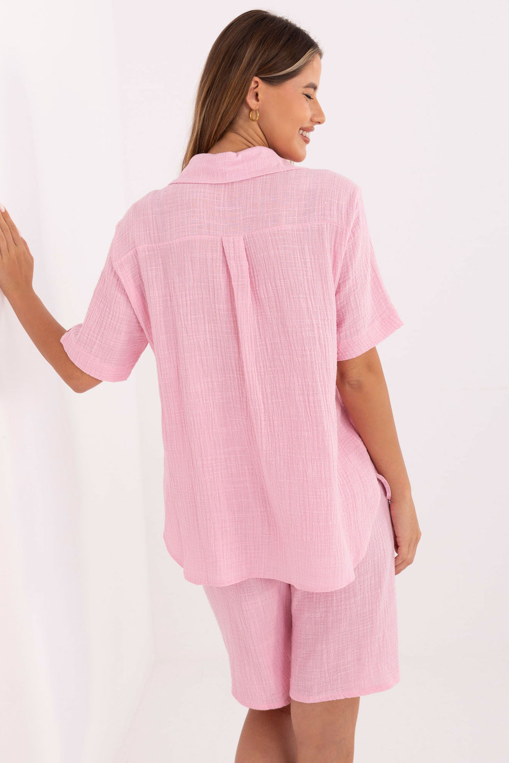 Lehká mušlinová sada skládající se z košile a kraťasů je ideální volbou pro teplé každodenní dny. Vyrobená z příjemného na dotek, dýchajícího bavlny, poskytuje maximální pohodlí a volnost pohybu. Hladký materiál zdůrazňuje minimalistický, ležérní styl sady. Košile s krátkým rukávem, límečkem a zapínáním na knoflíky vypadá elegantně a moderně, a dodatečný pásek k zavázání umožňuje zdůraznit pas a dodat ženský tvar postavě. Kraťasy s rovnými nohavicemi a vysokým pasem jsou vybaveny praktickými postranními kapsami. Sada se skvěle hodí na každodenní nošení, pro procházky, nákupy nebo setkání s přáteli.