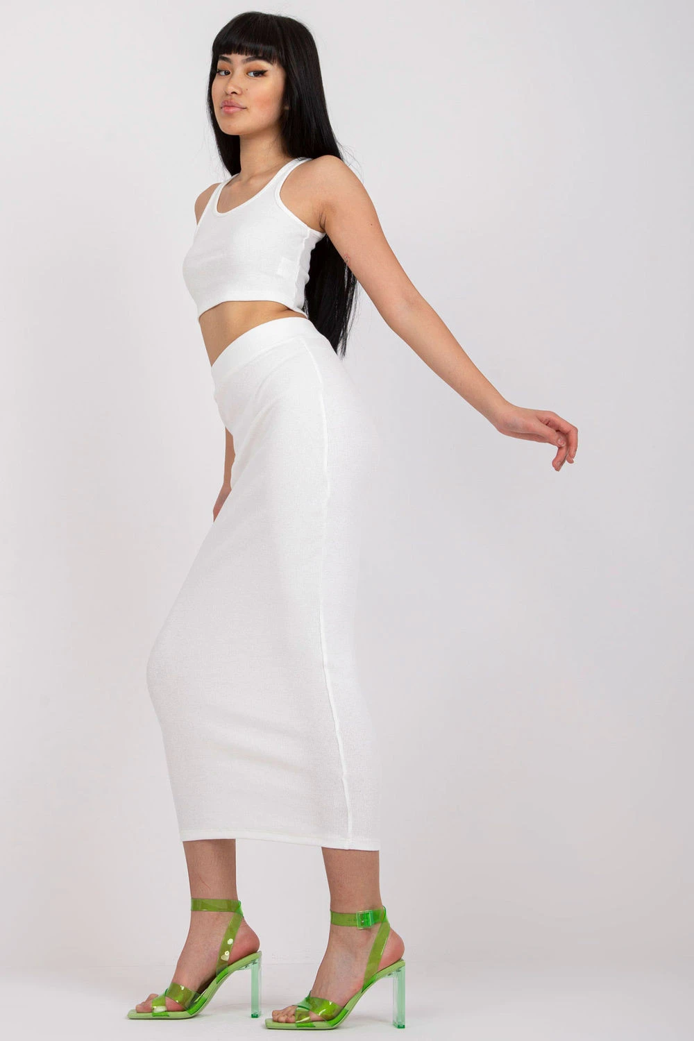 Dámský set z pruhovaného materiálu je ideální volbou pro každodenní, neformální stylizace. Součástí setu je přiléhavý top bez rukávů s kulatým výstřihem a midi sukně s vysokým pasem. Celý kousek je vyroben z příjemného elastického materiálu, který kombinuje bavlnu a elastan pro pohodlí a skvělé přizpůsobení postavě. Hladký vzor a minimalistický střih dělají z tohoto setu skvělý doplněk jak k sportovní obuvi, tak k elegantnějším doplňkům. Bez kapes zdůrazňuje jeho jednoduchost a moderní charakter. Guma v pasu zajišťuje pohodlí a stabilitu při nošení. Ideální volba pro procházky, nákupy nebo setkání s přáteli, stylový, pohodlný a univerzální.