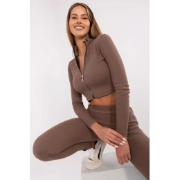 Casual dámský set z pruhovaného materiálu je ideální volbou pro každodenní pohodlné stylování. Součástí setu je krátká mikina s límcem, dlouhým rukávem a praktickým zipem, a kalhoty s dlouhými, sevřenými nohavicemi a vysokým pasem. Set je vyroben z měkké, elastické látky z kombinace bavlny a elastanu, která poskytuje pohodlí a volnost pohybu. Hladký vzor a pruhovaná struktura materiálu dodávají celku moderní, minimalistický vzhled. Chybějící kapsy zdůrazňují sportovně-městský charakter setu a přizpůsobený střih zajišťuje, že set perfektně sedí na postavě. Skvělá volba na každý den, ideální na procházky, nákupy nebo relaxaci v domácím útulku. Stylový, funkční a nesmírně pohodlný.