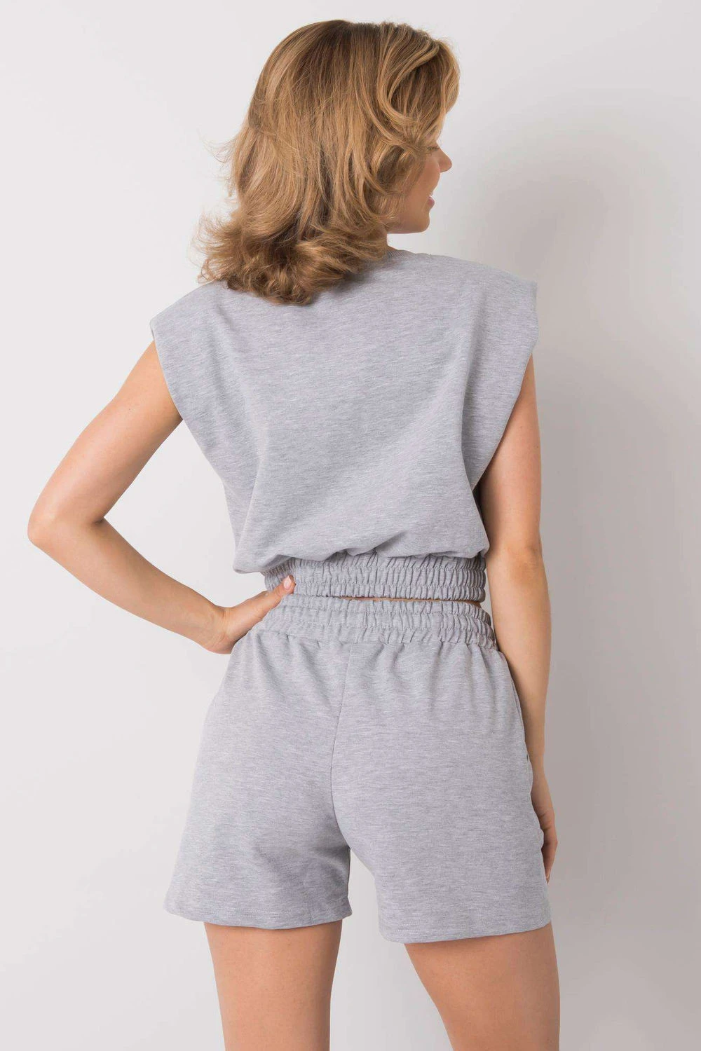 Dámský set skládající se z mikiny a kraťasů je ideální volbou na každý den a sportovní stylizace. Hladký, jednobarevný materiál dodává celku minimalistický a moderní charakter. Mikina s krátkým střihem, kulatým výstřihem a vloženými polštářky na ramenou decentně zdůrazňuje postavu, přidává strukturu. Bez rukávů zajišťuje volnost pohybu a pohodlí v teplejších dnech. Kraťasy s rovným střihem a středním (pravidelným) pasem mají boční kapsy a praktické šňůrky v pase, které umožňují individuální přizpůsobení. Set vyrobený z směsi bavlny, polyesteru a elastanu spojuje přirozenou měkkost s pružností a odolností materiálu.