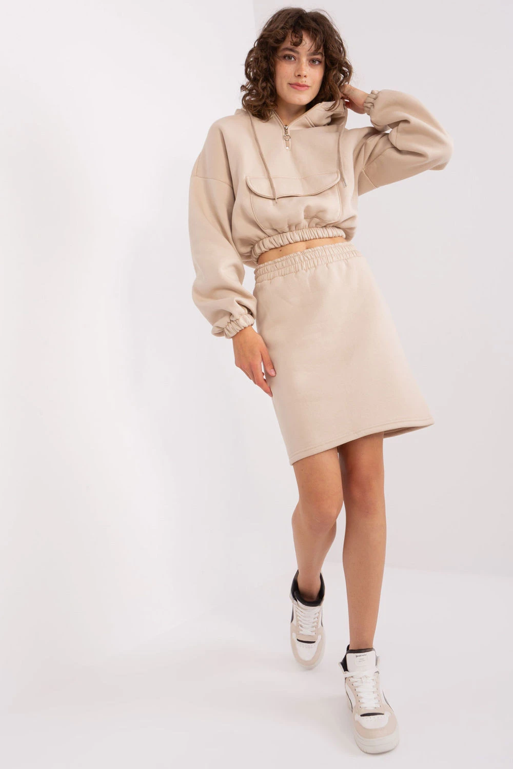 Elegantní a pohodlný dámský set skládající se z krátké mikiny a sukně je ideální volbou pro každodenní outfit v duchu casual a sportovním. Vyrobený z měkké, příjemné na dotek látky složené z bavlny a polyesteru, zajistí pohodlí a odolnost. Díky dodatečnému zateplení se set hodí i na chladnější dny. Mikina s dlouhým rukávem a kapucí má šňůrky k nastavení a praktická kapsa na přední straně s páskem přidává funkčnost a originální charakter. Kratší střih mikiny v kombinaci s vysokým pasem sukně vytváří trendy, ženský vzhled. Sukně s pohodlnou gumou v pasu se perfektně přizpůsobí postavě, zdůrazňující pas a zároveň poskytuje volnost pohybu. Hladký vzor dělá set univerzálním a snadným na stylování. Ideální kombinace na každodenní vycházky, procházky nebo setkání s přáteli, spojuje sportovní pohodlí s módním vzhledem.