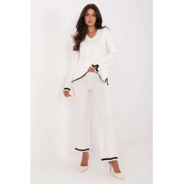 Casual dámský set svetrový skládající se ze svetra a kalhot, vytvořený s ohledem na každodenní pohodlí a moderní styl. Vyrobený z měkké směsi viskózy, polyesteru a nylonu, zajišťuje pohodlí nošení a odolnost. Svetr s výstřihem do "V" a dlouhým rukávem se vyznačuje kontrastním lemem a moderními rozříznutími dole a na manžetách, co mu dodává lehkosti a charakteru. Kalhoty s vysokým pasem a dlouhými nohavicemi zakončenými decentními rozřezáními skvěle ladí se svetrem, vytvářející souvislý a stylový celek. Hladký vzor a kontrastní detaily dělají z tohoto setu kombinaci jednoduchosti s nádechem originality, skvělá volba pro každodenní nošení pro ženy, které oceňují pohodlí v módním provedení.