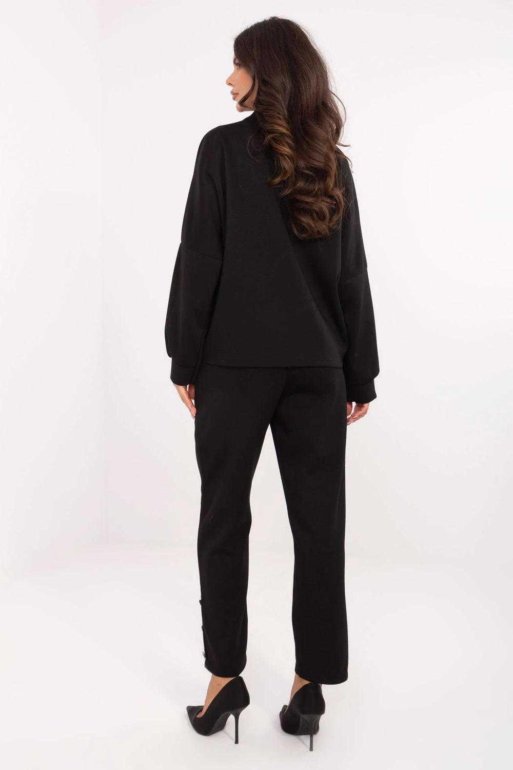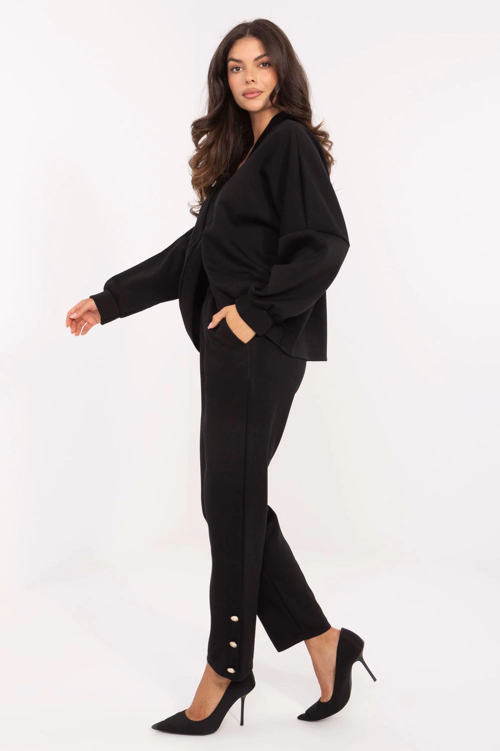 Dámský kompletní set v casual stylu je ideální nabídkou pro ženy, které ocení pohodlí a decentní eleganci. Vyrobený z měkkého, elastického materiálu typu viskóza s přídavkem elastanu, vyniká výjimečnou jemností a příjemností na dotek. Mikina se zapínáním na knoflík s výstřihem do podkovy a dlouhými rukávy dodává celku ženský charakter. Kalhoty s vysokým pasem mají pohodlný elastický pas, rovné nohavice a praktické boční kapsy. Na spodním okraji nohavic a v pase jsou umístěny dekorativní knoflíky, které představují stylový detail, který zdůrazňuje výjimečný charakter setu. Tento kompletní set se hodí jako pohodlný a módní outfit na každý den, hladký, univerzální a nadčasový.