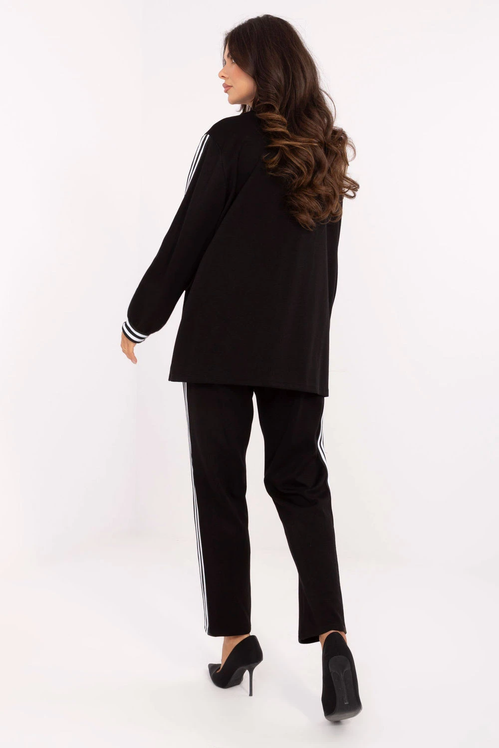 Dámský casual outfit je ideální kombinací pohodlí a moderního vzhledu. Vyrobena z velmi měkkého, jemného a příjemného materiálu, který poskytuje maximální pohodlí. Sako se zapínáním na knoflík s dlouhým rukávem je zdobené ozdobnými proužky a nášivkou na hrudi, co dodává celému outfitu moderní, sportovně elegantní charakter. Kalhoty se stočenými nohavicemi a vysokým pasem mají praktické bokové kapsy a šněrování v pase, které umožňuje přizpůsobit je postavě. Proužky podél nohavic zdůrazňují dynamický styl outfitu. Tento outfit je skvělou volbou pro každodenní nošení, hladký, stylový a mimořádně pohodlný.