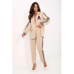 Dámský set v casual stylu je ideální kombinací pohodlí a moderního vzhledu. Vyrobený z velmi měkkého, jemného a příjemného materiálu, poskytuje maximální pohodlí při nošení. Sako s dlouhým rukávem se zapínáním na knoflík je zdobené ozdobnými proužky a nášivkou na hrudi, co dodává celku módní, sportovně elegantní charakter. Kalhoty se zúženými nohavicemi a vysokým pasem mají praktické boční kapsy a šňůrku v pasu, která umožňuje jejich přizpůsobení postavě. Proužky podél nohavic zdůrazňují dynamický styl celého setu. Set se skvěle hodí na každodenní nošení, je hladký, stylový a mimořádně pohodlný.