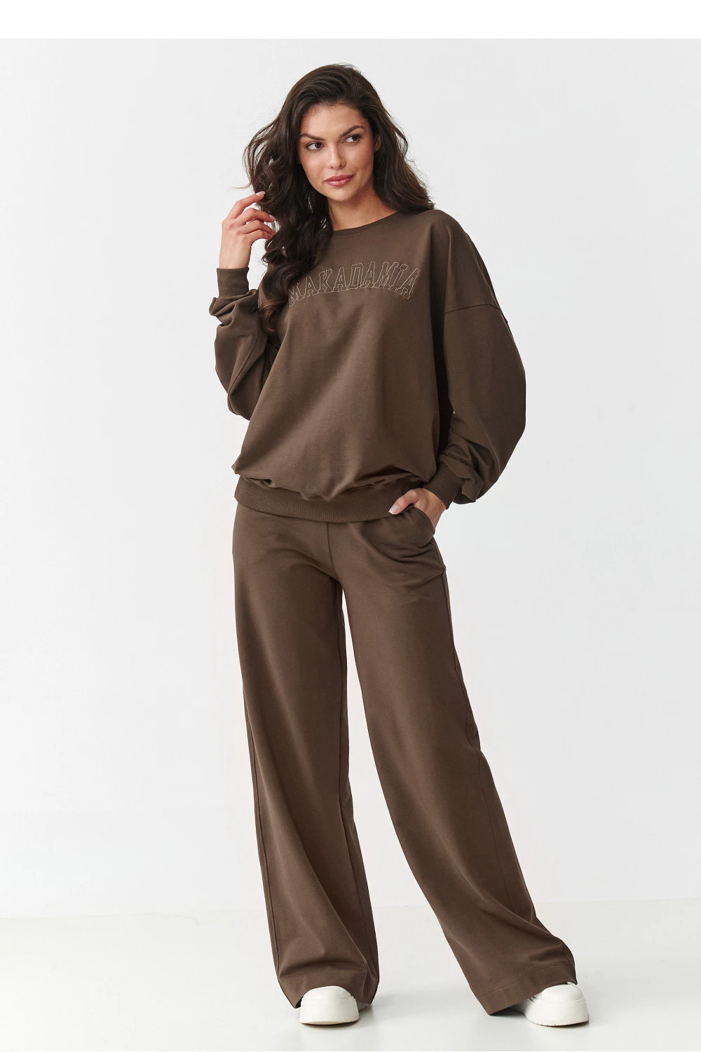Vsadte na spojení pohodlí a módního vzhledu s dámským teplákovým kompletěm, který se skvěle hodí jak na každodenní nošení, tak i na volný čas nebo relaxaci doma. Vyrobený z měkké, prodyšné pleteniny z 95% bavlny a 5% elastanu zaručuje pohodlné nošení a skvělé přizpůsobení postavy bez omezení pohybu. Horní část setu je klasická mikina s kulatým výstřihem a jemně sníženými rameny. Má lehce oversized střih, který dodává stylizaci volnosti a moderního charakteru. Její výjimečnost zdůrazňuje vyšívaná aplikace s logem vpředu, která dodává celku originalitu a jemný styl. Kalhoty se vyznačují módním střihem s širokými nohavicemi, které se krásně skládají při pohybu a dodávají postavě lehkost a vyváženost proporcí. Elastický pas a praktické kapsy zvyšují funkčnost a pohodlí nošení. Ideální volba na každé roční období, teplákový komplet s širokými nohavicemi a vyšíváním je must-have v ženské šatníku. Pohodlí, kvalita a módní vzhled v jednom setu!