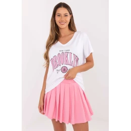 Casualní dámský set skládající se z trička a plisované sukně, ideální pro každodenní outfit. Tričko vyrobené z měkké bavlny s přídavkem elastanu má krátký rukáv, výstřih do srdce a módní potisk vpředu, který dodává outfitu charakter. Mini sukně s vysokým pasem je vyrobena ze stejného pohodlného materiálu a má vsazené šortky, které zajistí volnost pohybu. Plisovaná konstrukce dodává lehkost a ženskou eleganci, vytvářející set, který spojuje pohodlí s módním casual stylem.