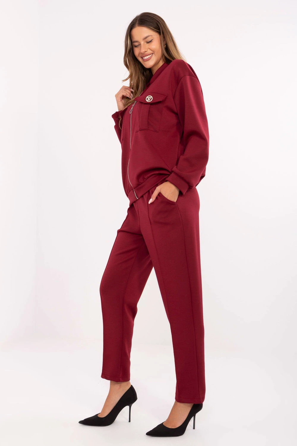 Dámský casual set vyrobený z měkkého a příjemného materiálu typu flanel. Set se skládá z bundy se zipem a kalhot s ozdobným páskem s přezkou v pasu, vytvářející stylový a pohodlný outfit na každý den. Bundy má stojáček, dlouhý rukáv a náprsní kapsy s klapkou vpředu, stejně jako jemné brože na kapsách jako elegantní detail. Kalhoty s vysokým pasem a zužujícími se nohavicemi jsou vybaveny bočními kapsami, kombinují pohodlí s moderním střihem. Hladký vzor a kombinace viskózy s elastanem zaručují měkkost, pružnost a pohodlí nošení. Tento set je ideální pro každodenní nošení, poskytující svobodu pohybu a elegantní, casual vzhled.