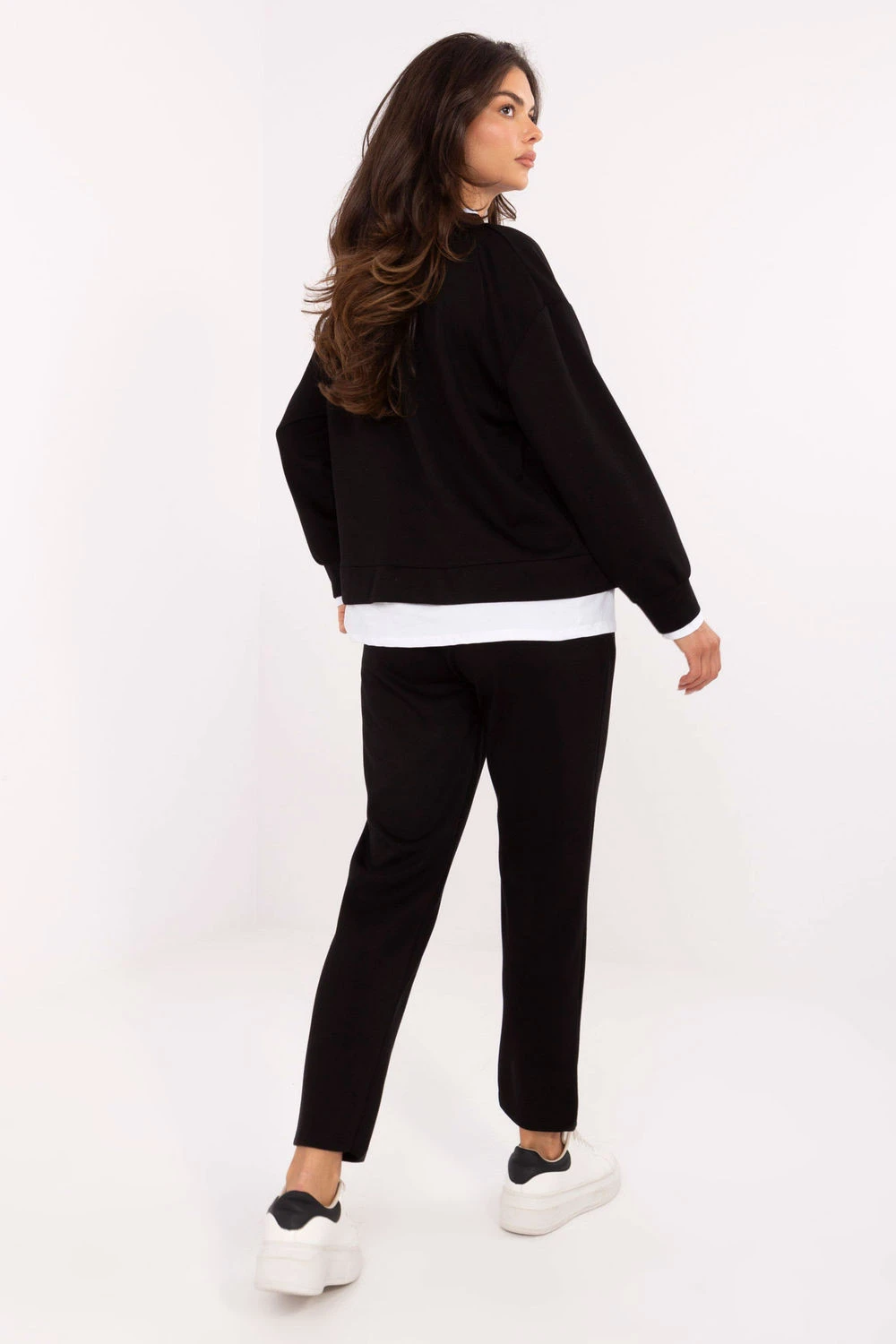 Dámský casual set vyrobený z materiálu typu měkká viskóza, jemná a mimořádně příjemná na dotek. Sada se skládá z mikiny s kulatým výstřihem a kalhot s vysokým pasem, vytvářející pohodlný a stylový outfit na každý den. Mikina má dlouhý rukáv, výstřih a spodní lem podsazený kontrastní látkou a decentní nášivku. Kalhoty s rovnými nohavicemi jsou vybaveny vysokým pasem s šňůrkou a bočními kapsami, poskytující pohodlí a moderní střih. Hladký vzor a kombinace viskózy s elastanem zaručuje měkkost, pružnost a volnost pohybu. Jedná se o ideální set na každodenní nošení, který spojuje pohodlí, eleganci a casual styl.