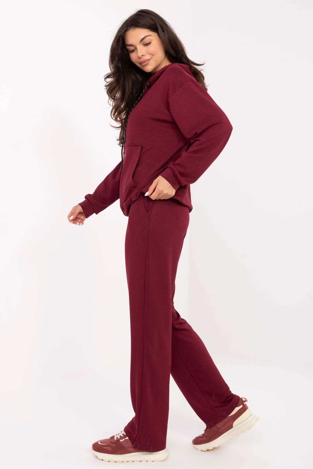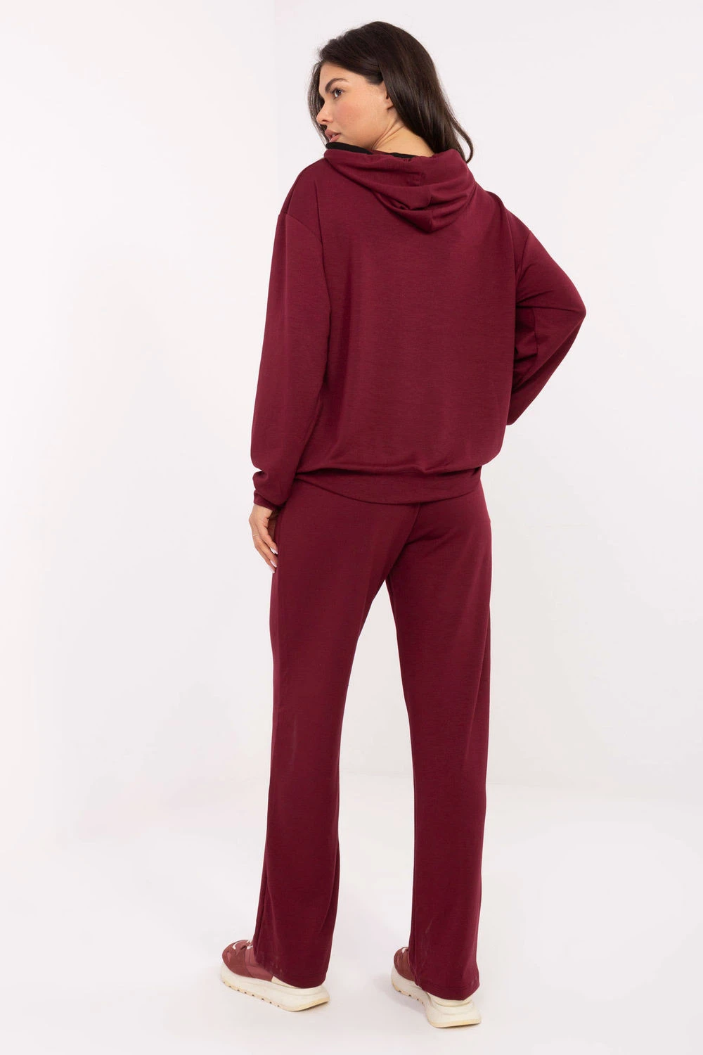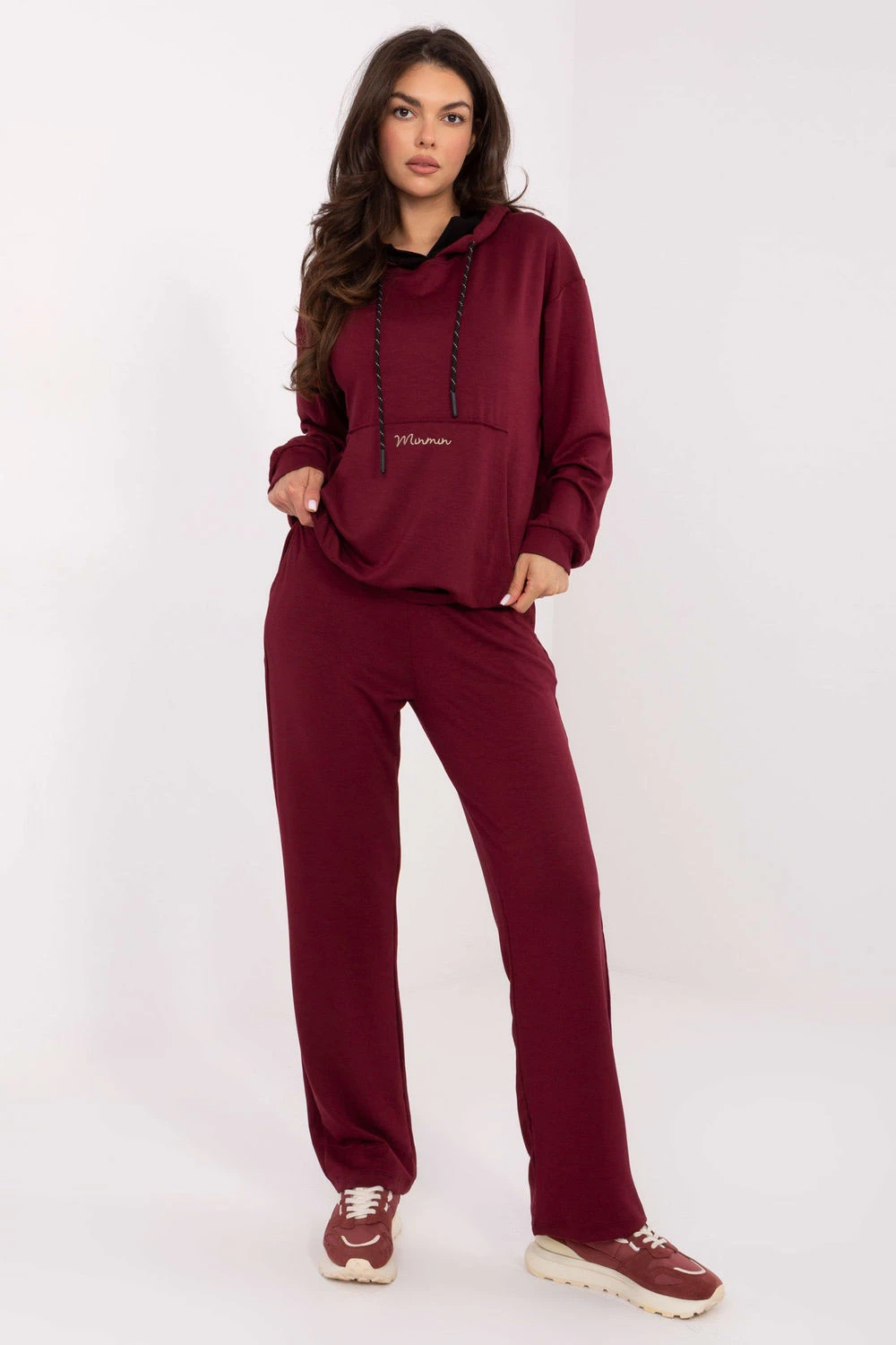 Dámský teplákový set skládající se z mikiny a kalhot v casual stylu, ideální na každodenní příležitosti. Vyrobený z mimořádně měkkého materiálu typu máslo jemného a příjemného na dotek, s převažujícím podílem viskózy a přídavkem elastanu pro větší pohodlí. Mikina standardní délky s dlouhým rukávem, kapucí a praktickou kapsou typu klokánek, zdobená decentním vyšíváním. Kalhoty s vysokým pasem, rovnými nohavicemi a bočními kapsami, také zdobenými malým vyšíváním na pasu. Hladký materiál a minimalistický design spojují pohodlí s moderním stylem.