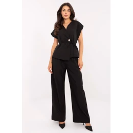 Elegantní dámský set skládající se z vesty a kalhot, skvělý na každý den, do práce a na společenské události. Vyrobený z kombinace viskózy a polyesteru, vyniká hladkou strukturou a klasickým charakterem. Vesta se zapínáním na knoflík má krátký kopertový rukáv a šněrování v pasu, které zdůrazňuje siluetu a dodává ženský půvab. Kalhoty s vysokým pasem s všitou gumou v pase zaručují pohodlí, a široké nohavice dodávají lehkost a eleganci. Boční kapsy umožňují spojení stylu s funkcionalitou, vytvářejíce moderní a nadčasový celek.