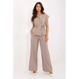 Elegantní dámský kostým skládající se ze saka a kalhot, skvělý na každý den, do práce a na slavnostní události. Vyrobený z směsi viskózy a polyesteru, vyniká hladkou strukturou a klasickým charakterem. Sako se zapíná na knoflík, má krátký klopový rukáv a šněrování v pasu, které zdůrazňuje siluetu a přidává ženský šarm. Kalhoty s vysokým pasem s všitou gumou v pase zaručují pohodlí, a široké nohavice dodávají lehkost a eleganci. Boční kapsy vytvářejí spojení stylu s funkčností, vytvářejíce moderní a nadčasový celek.