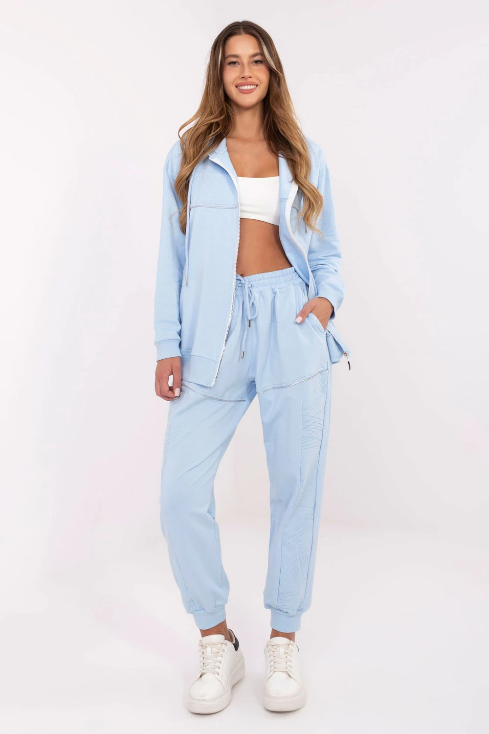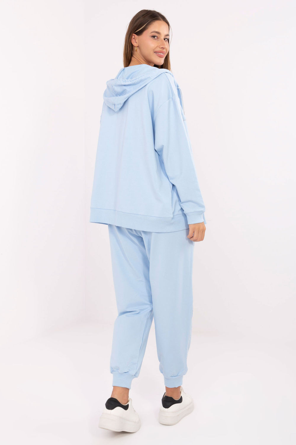 Dámský teplý komplet ve stylu casual, ideální na každodenní příležitosti. Vyrobený z bavlny s přídavkem elastanu, poskytuje pohodlí a volnost pohybu. Mikina s zipem má praktickou kapuci a kapsy na zip, a decentní potisk dodává celku módní charakter. Kalhoty s dlouhými nohavicemi zakončenými manžetami mají vysoký pas a nastavitelný pás s tkaničkou, co zaručuje perfektní přizpůsobení. Boční kapsy jsou skryté, co dělá komplet nejen pohodlným, ale i funkčním. Skvělá volba pro ženy, které ocení styl a pohodlí v jednom.