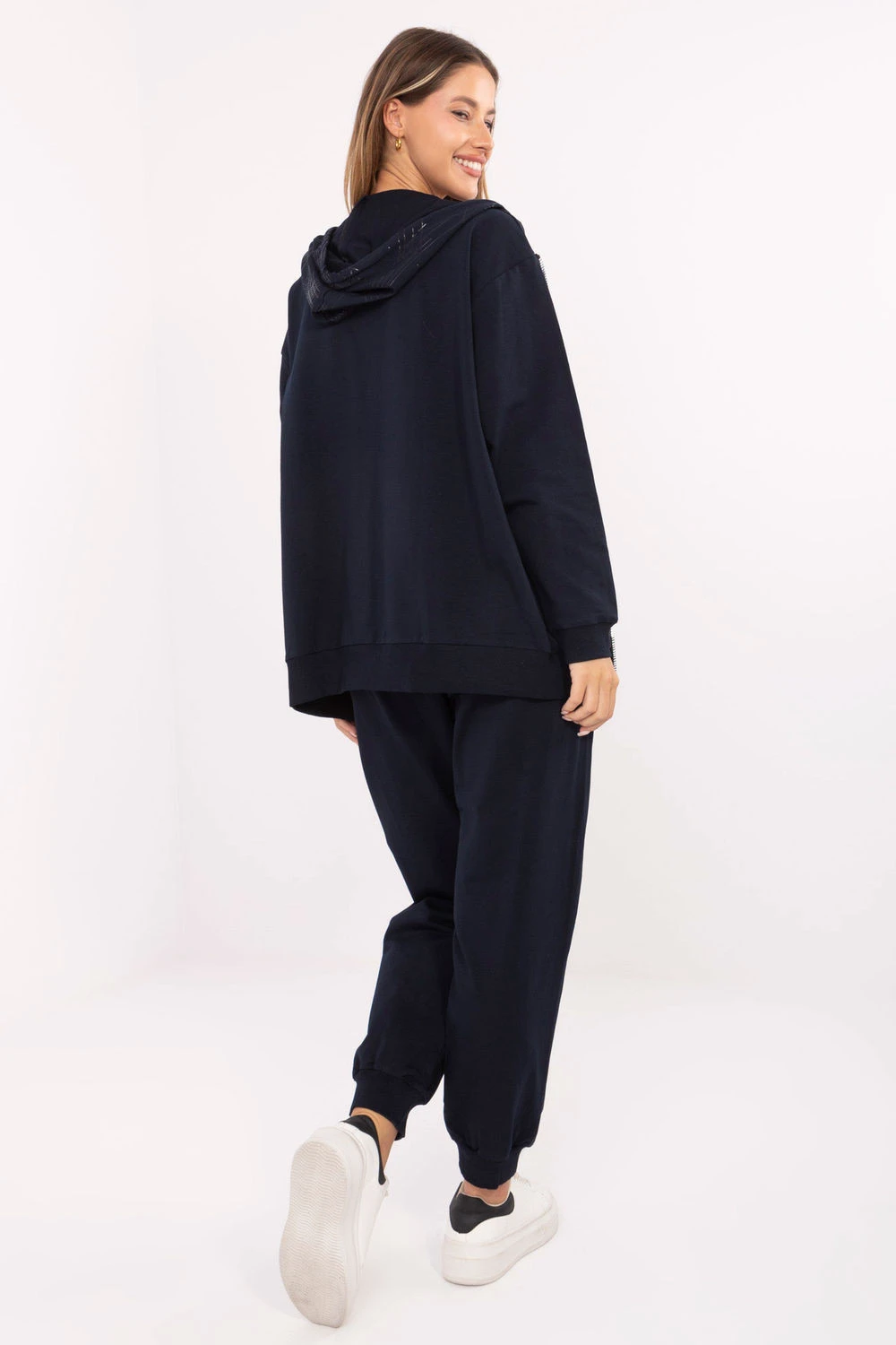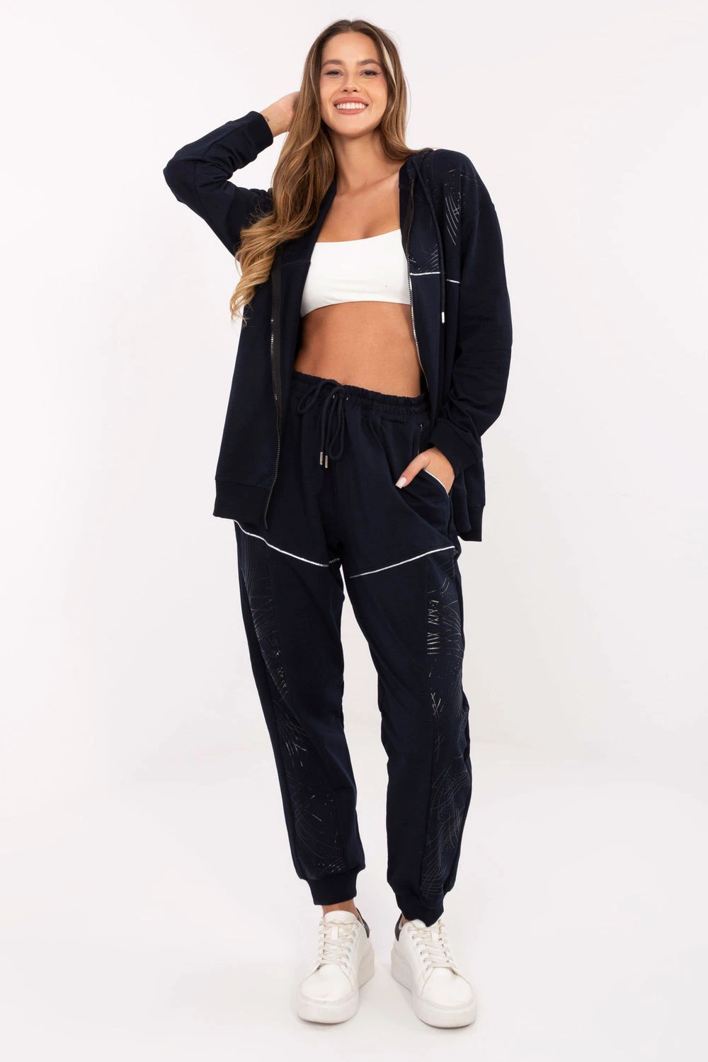 Dámský outfit ve stylu casual, ideální na každodenní příležitosti. Vyrobený z bavlny s přídavkem elastanu, poskytuje pohodlí a volnost pohybu. Mikina s zipem má praktickou kapuci a kapsy, a decentní potisk dodává celku módní charakter. Kalhoty s dlouhými nohavicemi ukončenými patentem mají vysoký pas a stahování v pase na šňůrku, co zaručuje ideální přizpůsobení. Boční kapsy jsou praktické a pohodlné. Skvělá volba pro ženy, které ocení styl a pohodlí v jednom.