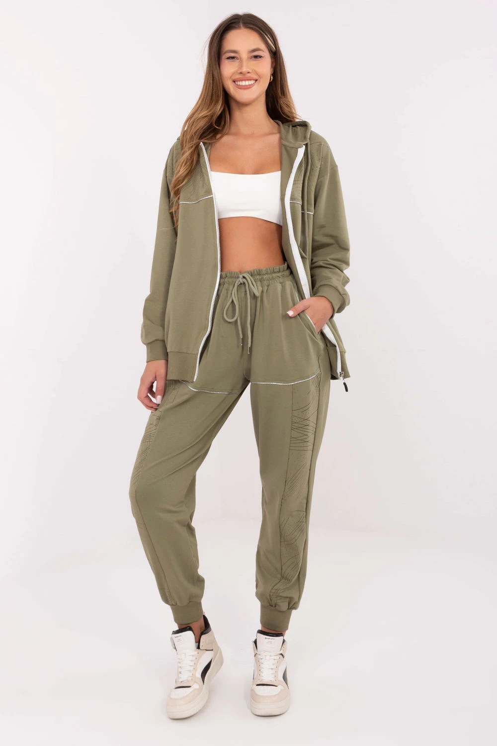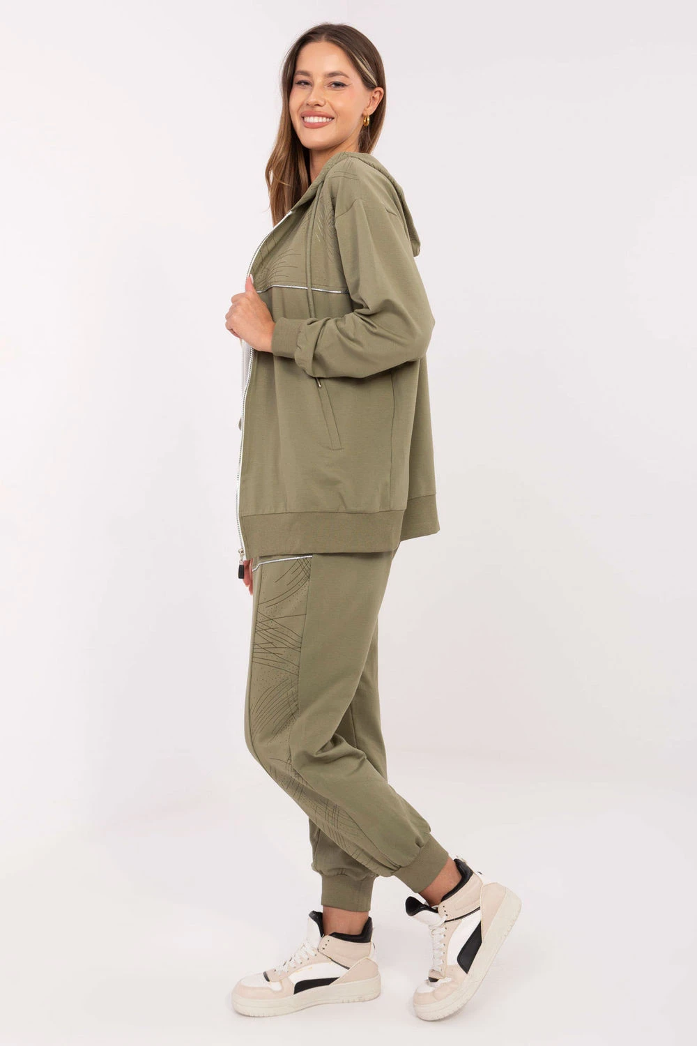 Dámský teplý set ve casual stylu, ideální na každodenní příležitosti. Vyrobený z bavlny s přídavkem elastanu, zaručuje pohodlí a volnost pohybu. Mikina s zipem má praktickou kapuci a vložené kapsy, a decentní potisk dodává celku moderní charakter. Kalhoty s dlouhými nohavicemi ukončenými upínacími manžetami mají vysoký pas a nastavitelný pas na šňůrku, co zaručuje ideální přizpůsobení. Vložené boční kapsy dělají set nejen pohodlným, ale i funkčním. To je skvělá volba pro ženy, které si cení styl a pohodlí v jednom.