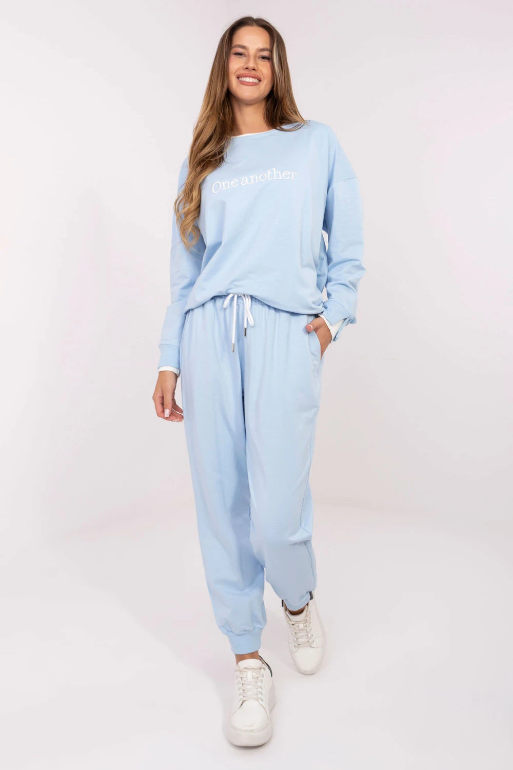 Dámský teplý set ve volném stylu, ideální na každodenní příležitosti. Vyrobený z bavlny s přídavkem elastanu, zajišťuje měkkost, pohodlí a volnost pohybu. Mikina s dlouhým rukávem a kulatým výstřihem je zdobená vyšívaným motivem a nápisy na přední straně, které dodávají celku moderní charakter. Kalhoty s dlouhými nohavicemi ukončené manžetami mají vysoký pas a boční kapsy, díky nimž jsou pohodlné a praktické. Jedná se o set, který spojuje pohodlí s moderním stylem a hodí se do každodenních outfitů.