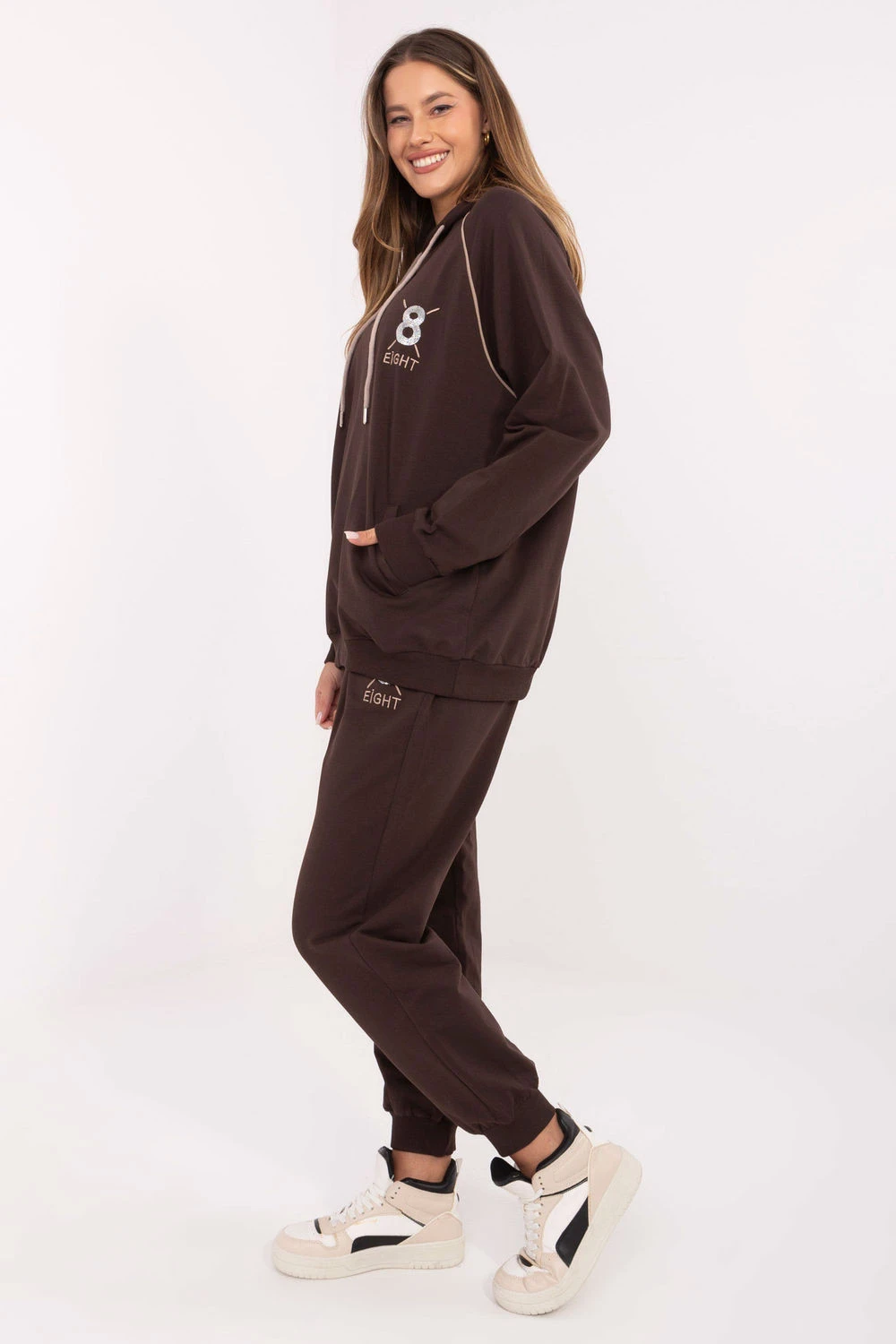 Dámský sportovní set ve casual stylu, navržený pro každodenní outfit. Vyrobený z bavlny s přídavkem elastanu, zaručuje měkkost, pohodlí a volnost pohybu. Mikina s kapucí s nastavitelnými šňůrkami a dlouhým rukávem se vyznačuje vyšívaným motivem na přední straně, zdobeným decentními čiróny, které dodávají celku elegantní akcent. Kalhoty s vysokým pasem a dlouhými nohavicemi zakončenými manžetami mají praktické boční kapsy, díky čemuž jsou pohodlné a funkční zároveň. Jedná se o set, který spojuje sportovní pohodlí s nádechem ženského lesku.
