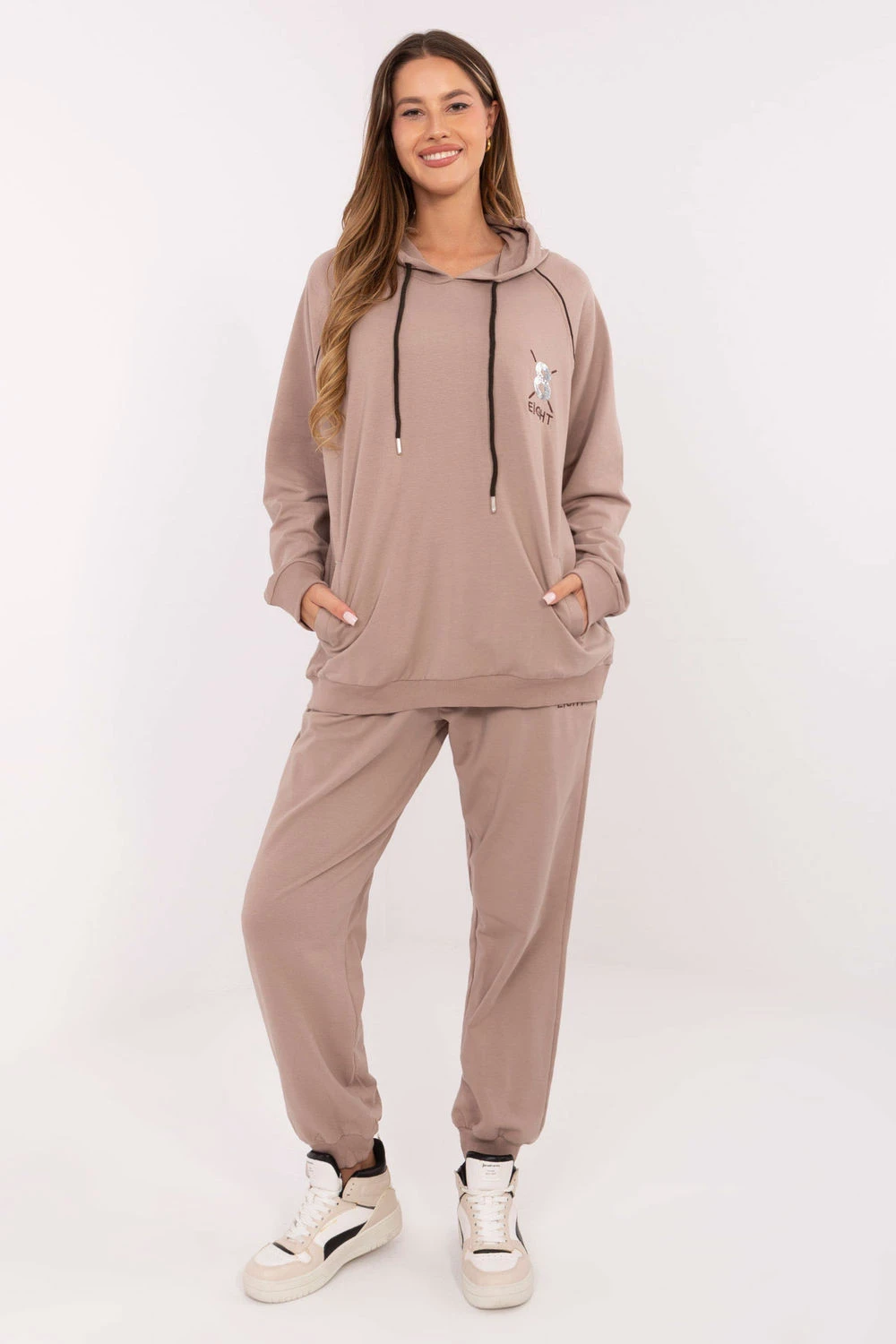 Dámský set dresový ve stylu casual, navržený s ohledem na každodenní stylizace. Vyrobený z bavlny s přídavkem elastanu zaručuje měkkost, pohodlí a volnost pohybu. Mikina s kapucí s nastavitelnými šňůrkami a dlouhým rukávem se vyznačuje vyšívaným motivem na přední straně zdobeným jemnými cirkóny, které dodávají celku elegantní akcent. Kalhoty s vysokým pasem a dlouhými nohavicemi zakončenými pružnými manžetami mají praktické boční kapsy, díky nimž jsou zároveň pohodlné a funkční. Jedná se o set, který spojuje sportovní pohodlí s ženským leskem.