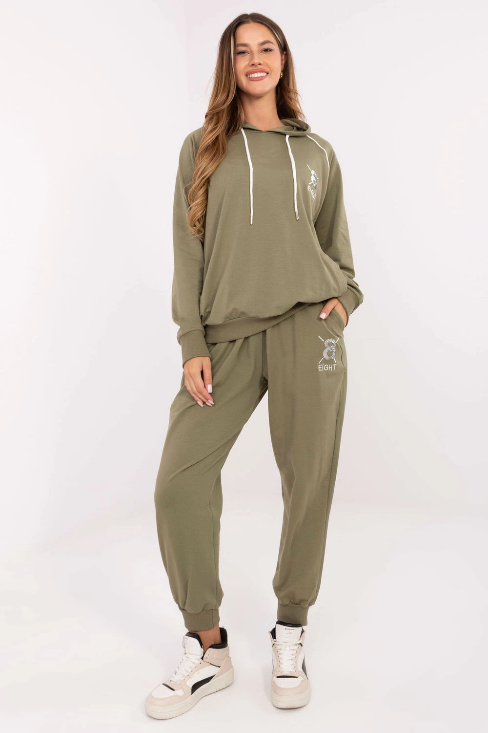 Dámský teplákový set v casual stylu, vytvořený s ohledem na každodenní střihy. Vyšívaný s kapucí s regulovatelnými šňůrkami a dlouhým rukávem se vyznačuje vyšívaným motivem na přední straně zdobeným jemnými zirkony, které dodávají celku elegantní akcent. Kalhoty s vysokým pasem a dlouhými nohavicemi zakončenými stahovacími šňůrkami mají praktické boční kapsy, díky nimž jsou pohodlné a funkční. Je to set, který spojuje sportovní pohodlí s ženským leskem.