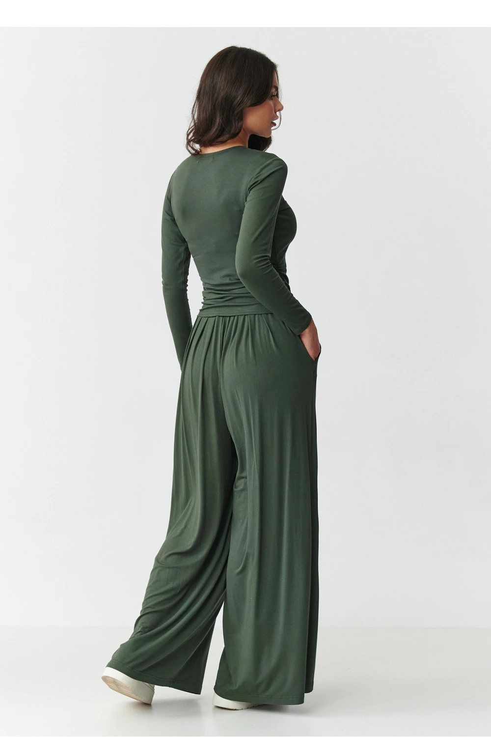 Tento set je ideální nabídkou pro ženy, které hledají spojení pohodlí, stylu a jemnosti. Vyrobený z měkké, příjemné na dotek viskózy, perfektně se přizpůsobuje siluetě, poskytuje volnost pohybu a pohodlí po celý den. Vrchní částí sestavy je přiléhavý top s dlouhým rukávem, který se vyznačuje jemným ruchem na bocích. Tento ženský detail nejen zdůrazňuje pas, ale také celku dodává elegantní, avšak nenáročný charakter. Toto spojení jednoduchosti s módním detailu dělá top skvělým nejen jako součást setu, ale i samostatně v mnoha stylizacích. Široké, volně padající kalhoty jsou zárukou pohodlí a stylu v jednom. Díky elastickému pasu a volnému střihu se skvěle hodí do pohybu a boční kapsy jim přidávají funkčnost. Toto je ideální střih jak pro nošení doma, tak i ve streetových stylizacích. Dámská sestava je k dispozici v módních, univerzálních barvách: antracitová, černá, čokoládová, khaki a bordová. Sáhněte po pohodlí, které jde ruku v ruce s ženským vzhledem, a vyberte si set z viskózy, který se přizpůsobí vašemu životnímu stylu a siluetě.