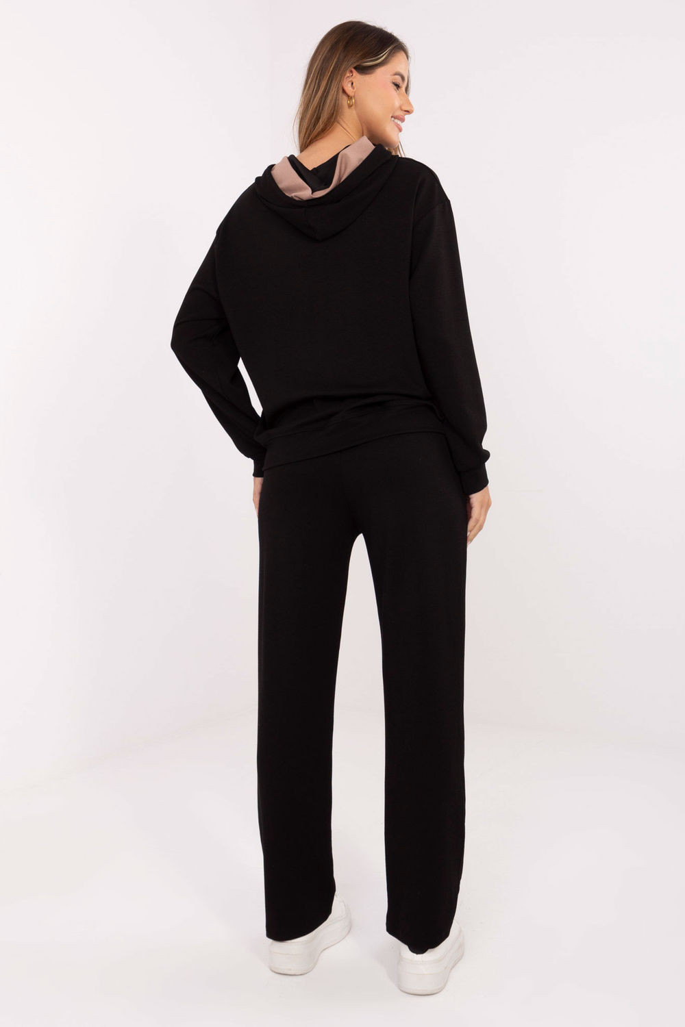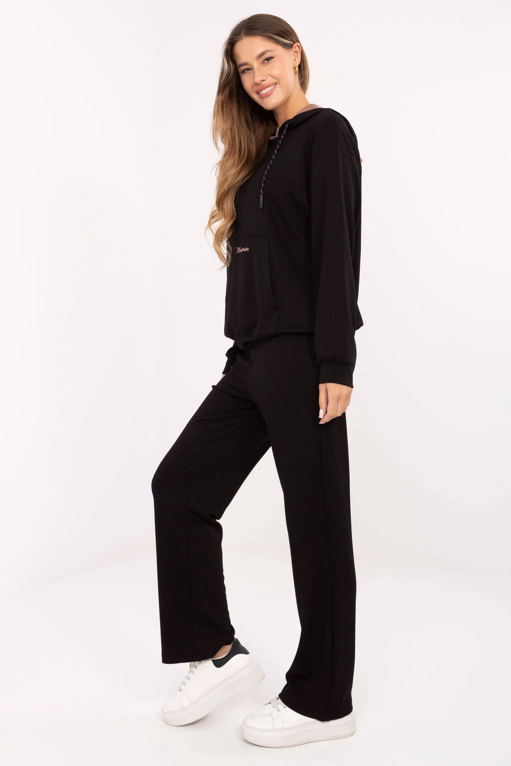 Dámský sportovní set skládající se z mikiny a kalhot ve volném stylu, ideální pro každodenní příležitosti. Vyrobený z mimořádně měkkého materiálu jako másla, jemného a příjemného na dotek, s převahou viskózy a přídavkem elastanu pro větší pohodlí. Mikina standardní délky s dlouhým rukávem, kapucí a praktickou kapsou typu klokánek, zdobená decentním vyšívaným motivem. Kalhoty s vysokým pasem, rovnými nohavicemi a bokovými kapsami, také zdobené malým vyšívaným motivem v páse. Hladký materiál a minimalistický design dělají z tohoto setu spojení pohodlí s moderním stylem.