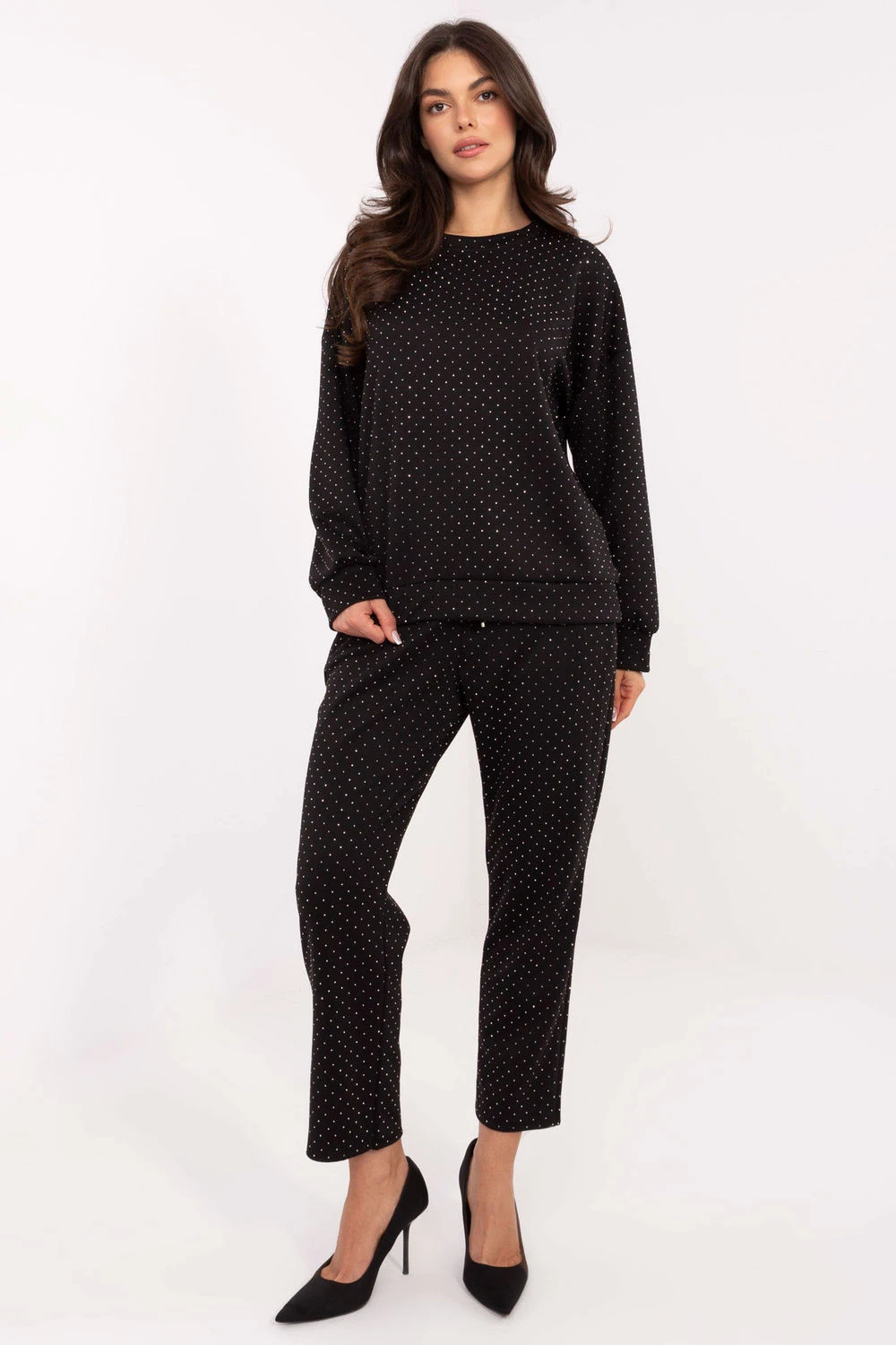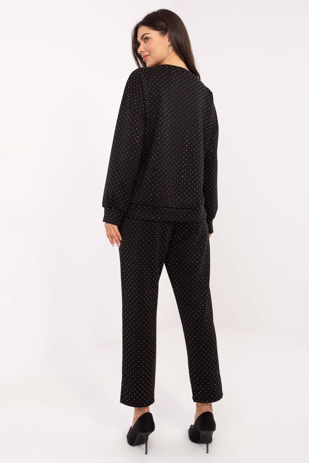 Stylový a pohodlný dámský teplákový set je nabídkou pro ženy, které ocení eleganci v každodenním outfitu. Sada se skládá z mikiny a kalhot, vytvářející harmonický celek s výrazně ženským charakterem. Model je vyroben z měkké směsi viskózy a polyesteru, která se skvěle přizpůsobuje postavě, poskytuje pohodlí a estetický vzhled. Celý povrch materiálu zdobí jemná aplikace z flitrů, dodávající setu elegantní, příležitostný styl. Kalhoty s vysokým pasem, rovnými dlouhými nohavicemi a šněrováním v pase zdůrazňují pas a zajišťují ideální přizpůsobení. Boční, vsazené kapsy přidávají praktičnost a volnost v každodenním používání. Tento set se skvěle hodí na mnoho příležitostí, je ideální do práce, na schůzky i na každý den. Spojuje pohodlí teplákové soupravy s elegancí příležitostného stylu, vytvářející univerzální a moderní vzhled.