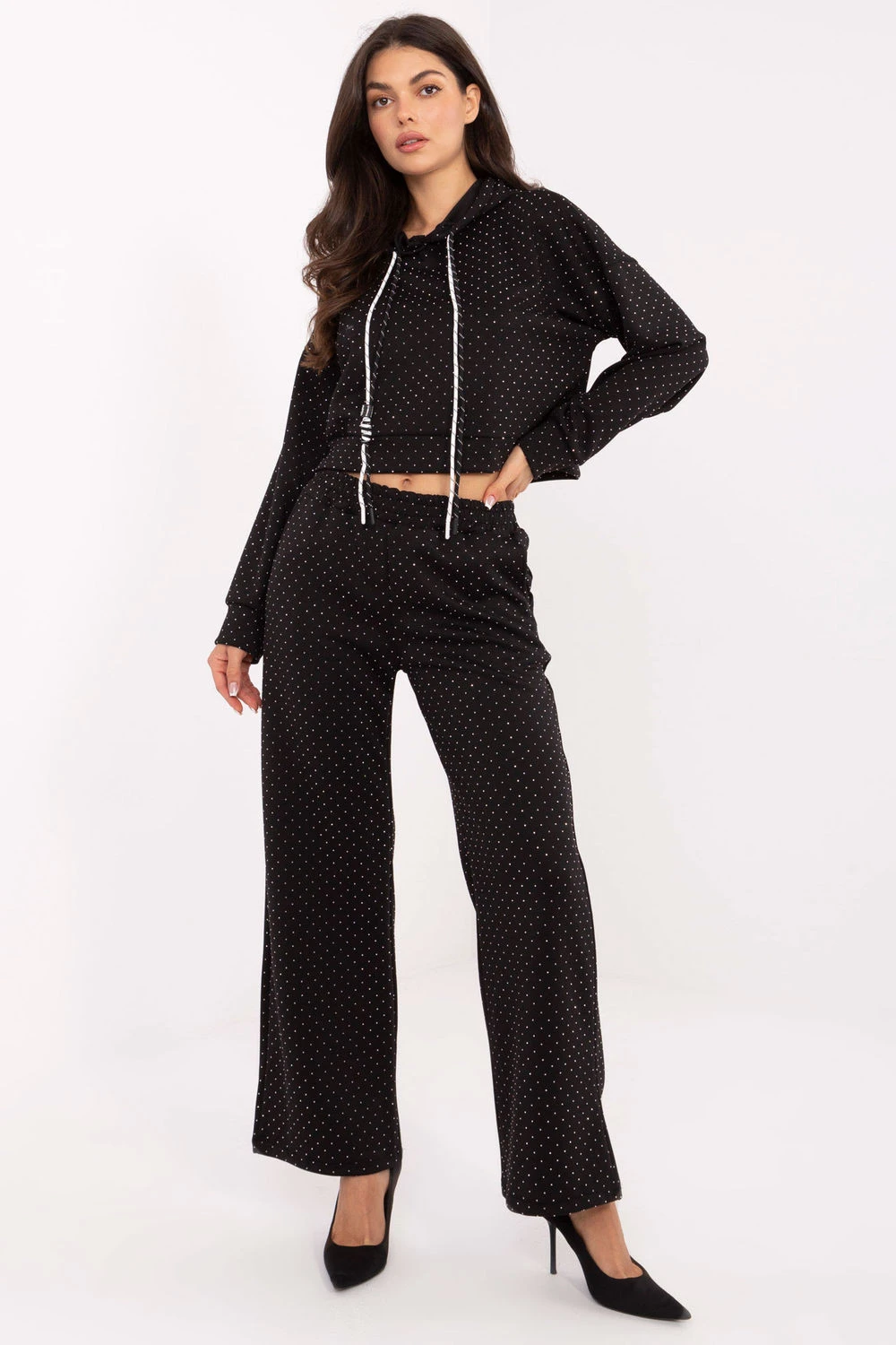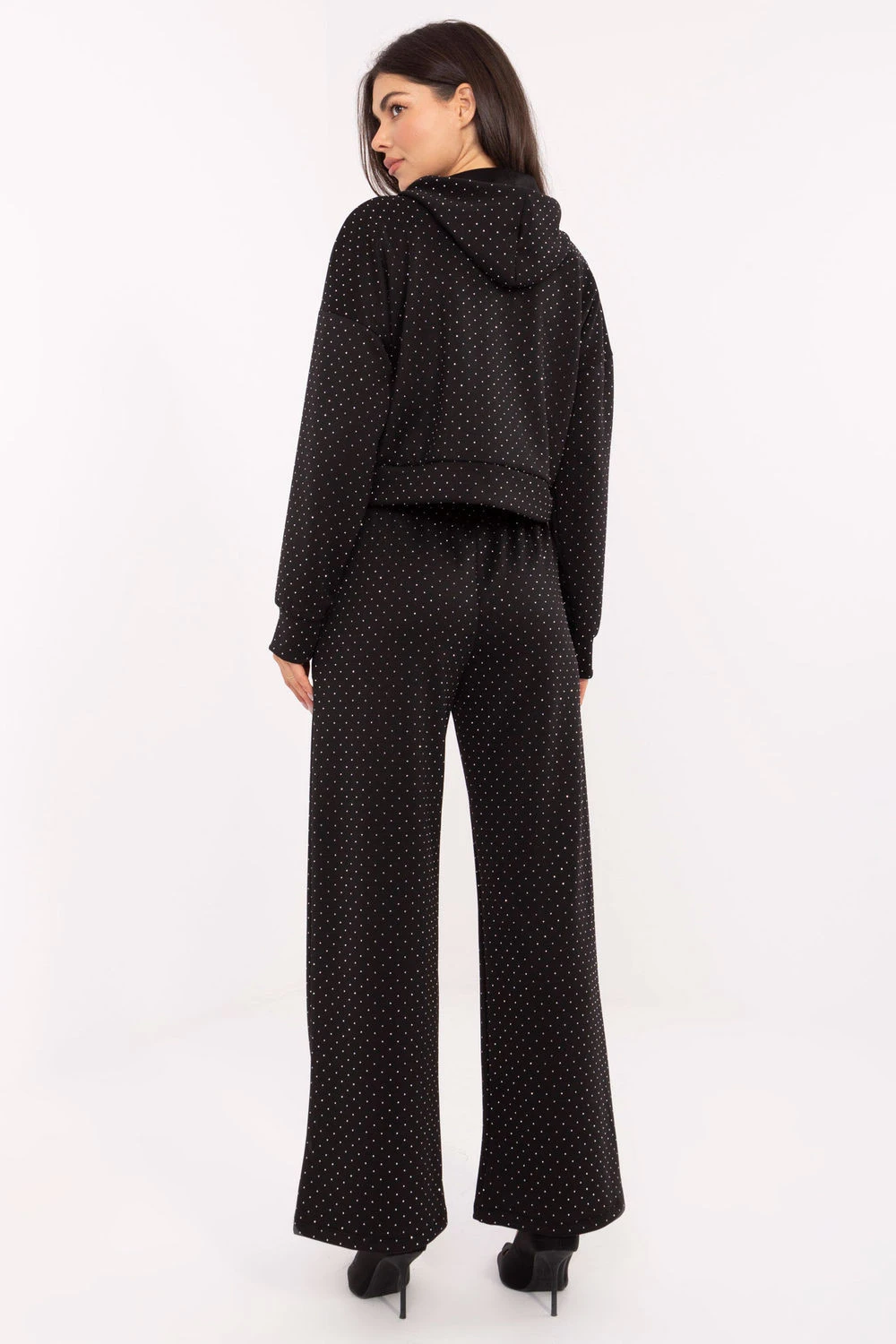 Tento dámský teplý set kombinuje eleganci a pohodlí, ideální pro každodenní stylování v casual stylu. Souprava se skládá z mikiny s kapucí a šňůrkami a kalhot s vysokým pasem a vsazenou gumou, vytvářející pohodlný a stylový vzhled. Vyrobený z směsi viskózy a polyesteru, set je příjemný na dotek, elastický a poskytuje volnost pohybu. Celou plochu látky zdobí efektní aplikace z flitrů, která dodává soupravě jemný lesk a eleganci. Kalhoty s širokými, dlouhými nohavicemi a bočními kapsami s zipem zvyšují pohodlí nošení, zatímco dlouhý rukáv mikiny a kapuce se šňůrkami dokončují funkční design. Je to ideální volba pro ženy, které chtějí spojit pohodlí teplákové soupravy s elegantním vzhledem v každodenním stylování.
