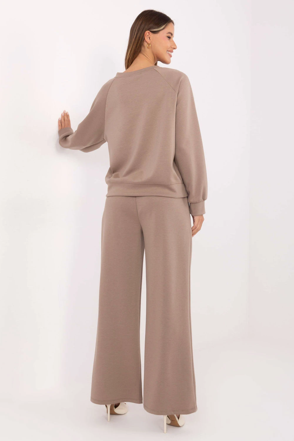 Dámský teplákový set vyrobený z velmi měkkého materiálu typu "máslo" je ideální kombinací pohodlí a stylu pro každodenní nošení. Tkanina z směsi viskózy, polyesteru a elastanu je mimořádně jemná, pružná a příjemná na dotek, díky čemuž se set skvěle hodí jak doma, tak při vycházkách do města. Set se skládá z volného, ležérního topu a kalhot s vysokým pasem, ve kterých je gumový lem zaručující dokonalé přizpůsobení siluetě. Široké nohavice dodávají celkovému vzhledu lehkost a moderní vzhled, a boční kapsy zdůrazňují praktický charakter setu.