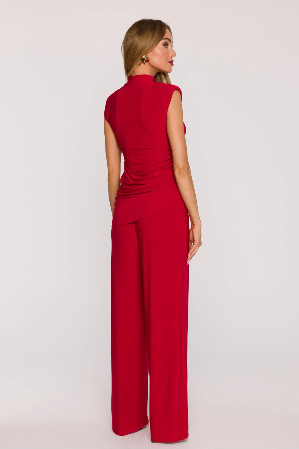 Moderní a elegantní dámský komplet vyrobený z hladké pleteniny, která je měkká, elastická a mimořádně pohodlná na nošení. Toto spojení pohodlí s rafinovaným stylem je ideální jak na každý den, tak na speciální příležitosti. Bezrukávový top zaujme přiléhavým střihem, rolákem a decentním záhybem, který zdůrazňuje siluetu a dodává jí lehkost. Asymetrický lem na spodní části přidává moderní dotek a opticky zúžuje postavu. Kalhoty s volným střihem mají široké nohavice a záložky v pásku, díky čemuž se krásně tvarují podle siluety a zajišťují plnou volnost pohybu. Boční kapsy přidávají funkčnost, a skrytý zip na zádech zaručuje estetické provedení. Komplet nemá podšívku, což z něj činí lehký a prodyšný. Celý kus byl navržen a ušit v Polsku s důrazem na každý detail. Tento dvoudílný set je skvělou volbou pro ženy, které oceňují pohodlí, eleganci a moderní minimalismus.