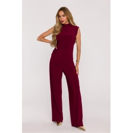 Moderní a elegantní dámský komplet vyrobený z hladké pleteniny, která je měkká, elastická a mimořádně pohodlná k nošení. Toto spojení pohodlí s rafinovaným stylem je ideální jak na každodenní nošení, tak na speciální příležitosti. Halenka bez rukávů okouzluje přiléhavým střihem, rolákem a decentním záhybem, který zdůrazňuje siluetu a dodává jí lehkost. Asymetrické zakončení dole přidává moderní akcent a opticky zúžuje postavu. Kalhoty s volným střihem mají široké nohavice a záložky na pasu, díky nimž se krásně přizpůsobují postavě a poskytují plnou volnost pohybu. Boční kapsy přidávají funkčnost a skrytý zip vzadu zaručuje estetické dokončení. Komplet nemá podšívku, což ho činí lehkým a prodyšným. Celý set byl navržen a ušit v Polsku s péčí o každý detail. Tento dvoudílný set je skvělou volbou pro ženy, které oceňují pohodlí, eleganci a moderní minimalismus.