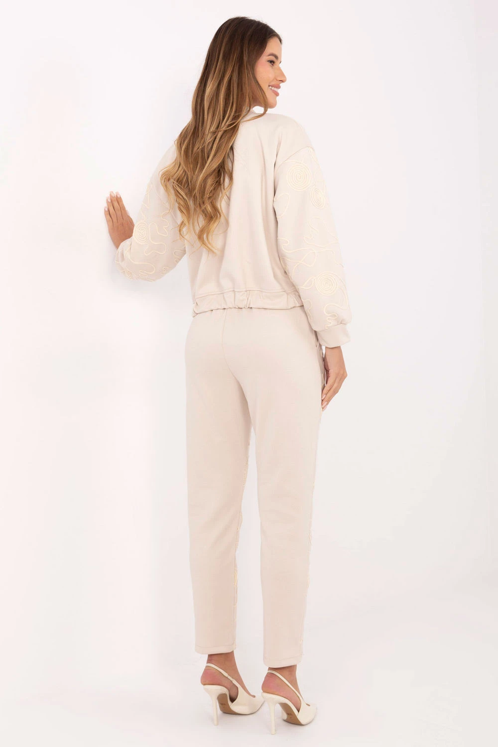 Elegantní a pohodlný dámský teplákový set skládající se z mikiny se zipem a kalhot s páskem. Vyrobený z vysoce kvalitní směsi viskózy a polyesteru, poskytuje měkkost, pružnost a pohodlí po celý den. Mikina má ležérní střih s límcem, dlouhými rukávy a kapsami s klopnami na přední straně, které jí dodávají charakter a praktičnost. Kalhoty mají vysoký pas, zúžené nohavice a boční kapsy, co zajišťuje pohodlí a moderní vzhled. Celý vzhled dotvářejí ozdobné vyšívání umístěné na rukávech mikiny a na přední straně kalhot, které dávají setu výjimečný, elegantní charakter. Tento ležérní set je ideální volbou pro každodenní outfit, kombinující pohodlí, moderní design a ženský detail.