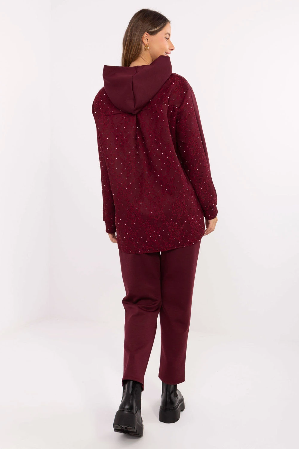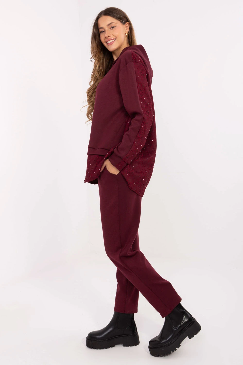 Elegantní a pohodlný dámský set v casual stylu, ideální na každý den. Vyroben z vysoce kvalitní směsi viskózy a elastanu, je elastický, prodyšný a mimořádně příjemný na dotek, což zaručuje maximální pohodlí nošení. Součástí setu je mikina s kapucí a kalhoty s dlouhými, zužujícími se nohavicemi. Mikina je zdobená aplikací z jehel a krajkovými vložkami na zádech, zadní části rukávů a dole vpředu, což dodává celku jemnou eleganci. Kalhoty mají vsazený gumový pas a boční kapsy, díky čemuž jsou pohodlné a praktické. Jedná se o skvělý set pro ženy, které ocení spojení pohodlí, ženskosti a módních detailů, ideální pro každodenní stylování, procházky nebo setkání s přáteli.