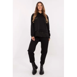Elegantní a pohodlný dámský set v casual stylu, ideální na každý den. Vyrobený z vysoce kvalitní směsi viskózy a elastanu, je elastický, prodyšný a mimořádně příjemný na dotek, co zaručuje maximální pohodlí nošení. Součástí setu je mikina s kapucí a kalhoty s dlouhými, sevřenými nohavicemi. Mikina se vyznačuje ozdobnou aplikací z jehlic a krajkovými vložkami na zádech, zadní části rukávů a dole vpředu, což dodává celku jemnou eleganci. Kalhoty mají vsazenou gumu v pasu a boční, zasouvací kapsy, díky čemuž jsou jak pohodlné, tak praktické. Jedná se o skvělý set pro ženy, které oceňují kombinaci pohodlí, ženskosti a módních detailů, ideální na každodenní stylizace, procházky nebo setkání s přáteli.