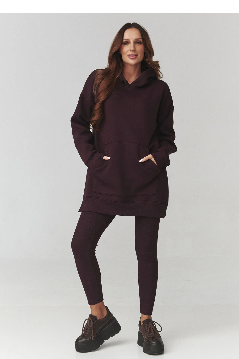 Vsadte na pohodlí a styl v jednom! Náš dámský set se skládá z delší mikiny s kapucí a legín ve stejném barevném provedení. Mikina má módní oversized střih a praktickou kapsu typu klokanka, ve které si zahřejete ruce nebo schováte drobnosti. Kvalitní, měkký materiál zajistí pohodlí po celý den, ideální jak pro každodenní stylizace, tak i na volné víkendy doma. Legíny se přizpůsobí postavě, zdůrazní její výhody a elastický materiál zajistí plnou volnost pohybu. Set můžete nosit společně nebo samostatně, vytvářející nekonečné, moderní stylizace.