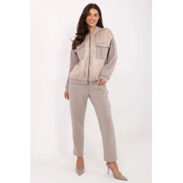 Stylový dresový set skládající se z mikiny a kalhot, ideální pro každodenní, casual stylizace. Vyrobený z vysoce kvalitní viskózy s různorodou fakturou, z měkkého, jemného a velmi příjemného materiálu, který zaručuje maximální pohodlí nošení. Mikina má dlouhý rukáv a praktickou kapuci, je zdobená ozdobným prošíváním na přední straně, což dodává celku moderní charakter. Model je zapínán na zip, co zvyšuje pohodlí nošení. Na hrudi jsou kapsy s patkami, ozdobené elegantními brožemi, přidávajícími jemnou originalitu a stylové zakončení. Kalhoty mají vysoký pas, se zužujícími se nohavicemi a vsazenou gumou v pase s dodatečným šňůrkováním, což zajišťuje ideální přizpůsobení a pohodlí. Jsou také vybaveny bočními, zasunutými kapsami, díky čemuž jsou praktické na každý den. Nohavice jsou dlouhé, pohodlné a skvěle padnoucí na postavě. Set okouzlí kombinací pohodlí, funkčnosti a moderních detailů, ideální pro ženy ocení styl v casual provedení.
