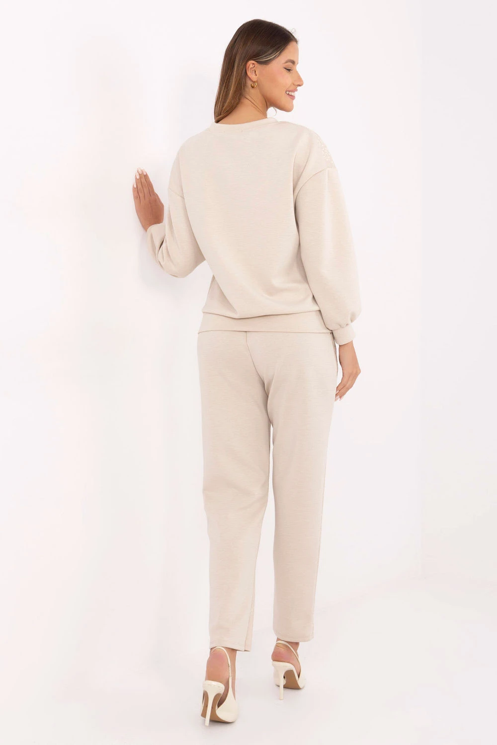 Stylový dámský teplý komplet skládající se z mikiny a kalhot je ideální volbou v casualovém provedení, skvělý pro každodenní stylizace a pohodlné nošení doma nebo ve městě. Model s aplikacemi na přední straně mikiny a kalhot (mimo rukávů) přitahuje pozornost, a kombinace krajky a flitrů dodává sestavě moderní, ženský charakter. Mikina s kulatým výstřihem a dlouhým rukávem zaručuje pohodlí a volnost pohybů. Kalhoty mají vysoký pas a dlouhé, zužující se nohavice, co zajišťuje pohodlné nošení a zdůrazňuje siluetu. Postranní kapsy jsou praktické a celý komplet je vyroben z příjemné směsi viskózy a elastanu, která zajišťuje pružnost a odolnost materiálu. Tento komplet je ideální volbou pro ženy, které oceňují pohodlí, stylový vzhled a decentní, elegantní detaily v každodenních stylizacích. Materiál je typu měkké máslo, jemný a mimořádně příjemný na dotek.