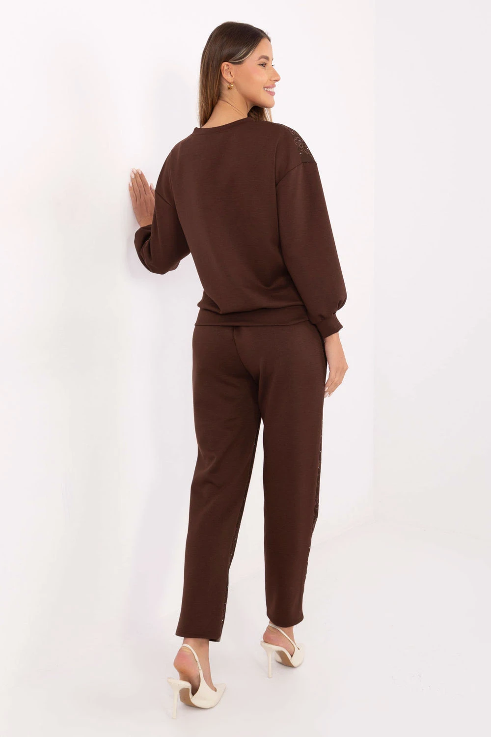 Elegantní dámský teplákový set skládající se z mikiny a kalhot je ideální volbou pro každodenní outfit, skvělý pro pohodlné nošení doma nebo ve městě. Model s aplikacemi na přední straně mikiny a kalhot (kromě rukávů) upoutá pozornost, a kombinace krajky a flitrů dodává outfitu módní ženský charakter. Mikina s kulatým výstřihem a dlouhým rukávem zaručuje pohodlí a volnost pohybu. Kalhoty mají vysoký pas a dlouhé, zužující se nohavice, co zajišťuje pohodlné nošení a zdůrazňuje siluetu. Postranní vložené kapsy přidávají praktičnost, a celý set je vyroben z příjemné směsi viskózy a elastanu, která zajišťuje pružnost a odolnost materiálu. Tento set je ideální volbou pro ženy, které ocení pohodlí, stylový vzhled a jemné, elegantní detaily v každodenních outfitech. Materiál je typu "máslo" - měkký, jemný a mimořádně příjemný na dotek.