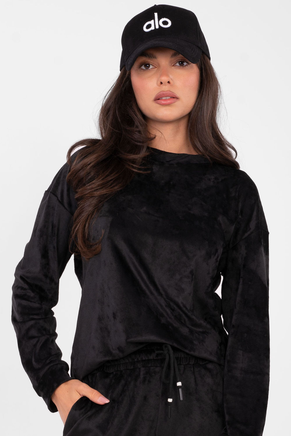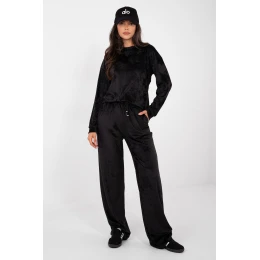 Dámský sametový set skládající se z mikiny a kalhot vyrobený z měkké a příjemné látky z bavlny a polyesteru. Mikina má klasický střih s dlouhými rukávy a kulatým výstřihem, ideální pro každodenní, volné stylizace. Kalhoty s přímými, dlouhými nohavicemi s vysokým pasem jsou vybaveny praktickými kapsami na bocích. Celý set doplňují šňůrky s jemnými zirkony, které přidávají subtilní a elegantní lesk celému outfitu. Hladký vzor a pohodlný střih zajišťují, že set je skvělý pro každý den a domácí relaxaci.
