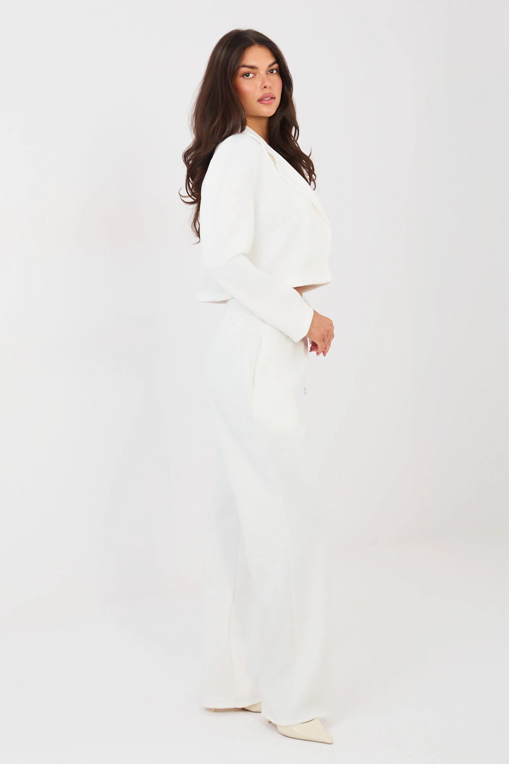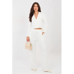 Elegantní dresový set: sako a kalhoty, které spojují eleganci s každodenním pohodlím. Šité z velmi příjemného na dotek materiálu typu měkké máslo, jemného a hladkého, zajistí maximální pohodlí a skvělé přizpůsobení postavě. Sako s límci a límečkem, zapínáním na knoflíky, dodává celému outfitu moderní, ležérní charakter. Dlouhý rukáv zdobený knoflíky je stylovým detail, který zdůrazňuje precizní zpracování. Kalhoty s vysokým pasem, dlouhými rovnými nohavicemi a vázaným pásem zaručují pohodlí a volnost pohybu. Model je vybaven bočními kapsami, které zvyšují funkčnost setu. Hladký vzor a pečlivě vybraná směs polyesteru, viskózy a elastanu zajistí, že set bude skvěle vypadat jak v každodenních outfitových kombinacích, tak i v práci v módním a pohodlném provedení. Je to ideální nabídka pro ženy, které ocení styl, pohodlí a všestrannost v jednom setu.