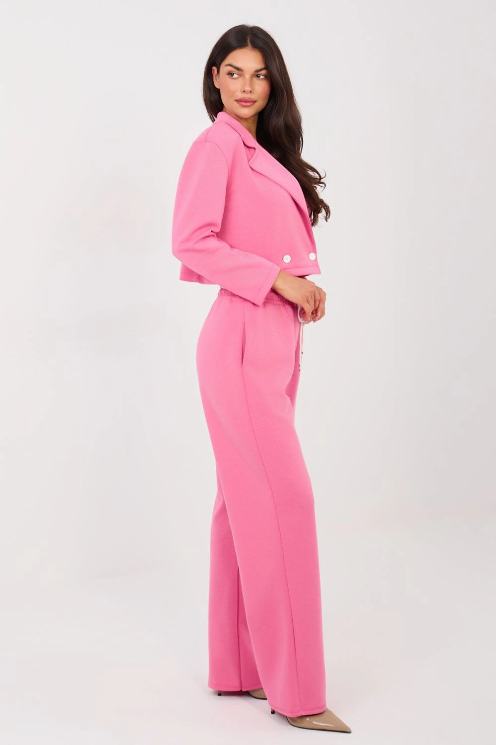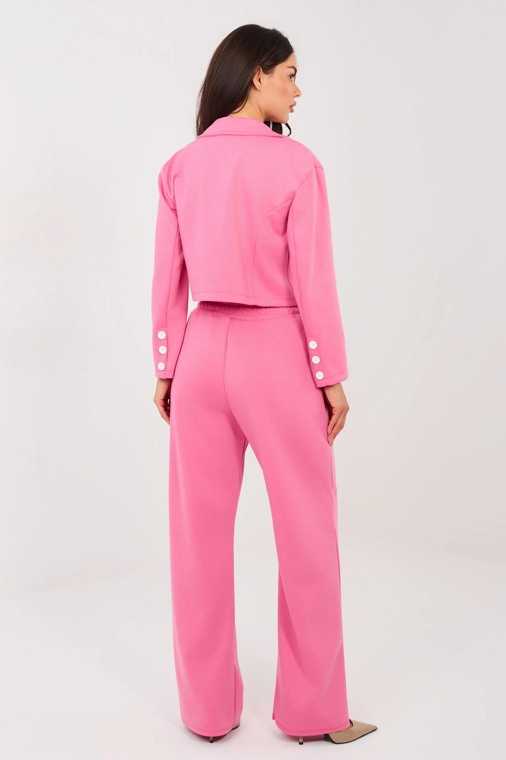 Elegantní komplet saka a kalhot: saka plus kalhoty, které spojují eleganci s každodenním pohodlím. Vyrobena z velmi příjemného materiálu typu měkké máslo, jemného a hladkého, poskytuje maximální pohodlí a skvělé přizpůsobení postavě. Sako s límci a límečkem, zapínací na knoflíky, dodává celku moderní, ležérní charakter. Dlouhý rukáv zdobený knoflíky je stylovým detail, který zdůrazňuje precizní zpracování. Kalhoty s vysokým pasem, dlouhými přímými nohavicemi a vázaným pásem zaručují pohodlí a volnost pohybů. Model je vybaven bočními kapsami, které zvyšují funkčnost kompletu. Hladký vzor a pečlivě vybraná směs polyesteru, viskózy a elastanu zajišťují, že komplet se perfektně hodí jak do každodenních stylizací, tak do práce v módním a pohodlném provedení. Jedná se o ideální nabídku pro ženy, které oceňují styl, pohodlí a univerzálnost v jednom kompletním outfitu.