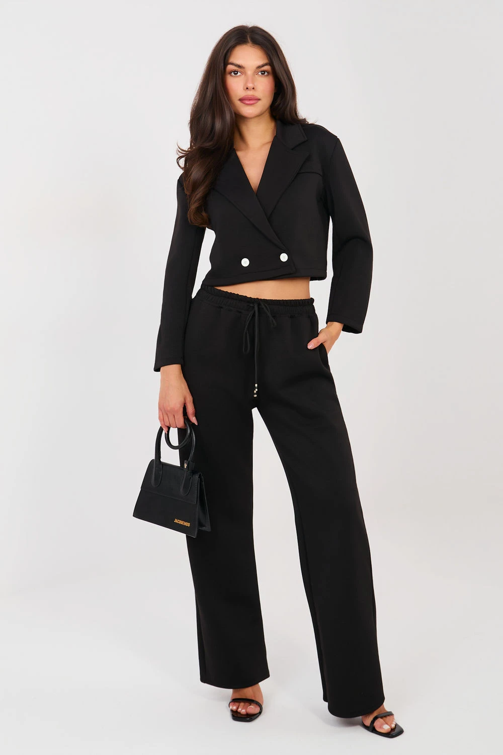 Elegantní set se dresovým oblečením: sako a kalhoty, které spojují eleganci s každodenním pohodlím. Vyrobena z velmi příjemného materiálu typu měkký máslo, jemného a hladkého, poskytuje maximální pohodlí a skvělé přizpůsobení postavě. Sako s límci a límečkem, zapíná se na knoflíky, dodává celkovému vzhledu moderní, volnočasový charakter. Dlouhý rukáv zdobený knoflíky je stylovým detail, který zdůrazňuje precizní zpracování. Kalhoty s vysokým pasem, dlouhými přímými nohavicemi a vázaným pásem zaručují pohodlí a volnost pohybu. Model je vybaven bočními kapsami, které zvyšují funkčnost setu. Hladký vzor a pečlivě vybraná směs polyesteru, viskózy a elastanu zajišťují, že set se skvěle hodí jak do každodenního stylu, tak do práce v moderním, pohodlném provedení. Je to ideální nabídka pro ženy, které oceňují styl, pohodlí a všestrannost v jednom setu.