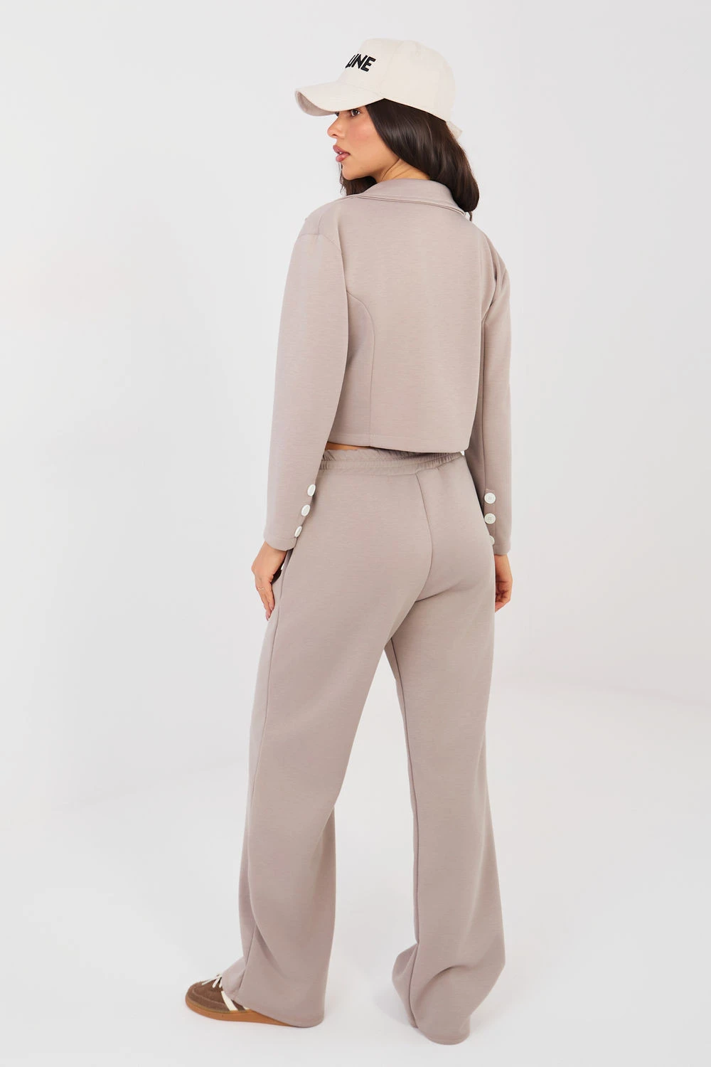 Elegantní dresový set: sako a kalhoty, které spojují eleganci s každodenním pohodlím. Vyrobena z velmi příjemného materiálu typu jemného máslového doteku, jemného a hladkého, zaručuje maximální pohodlí a skvělé přizpůsobení postavě. Sako s límci a límečkem, zapínací na knoflíky, dodává celku moderní, ležérní charakter. Dlouhý rukáv zdobený knoflíky je stylovým detail, který zdůrazňuje precizní provedení. Kalhoty s vysokým pasem, dlouhými přímými nohavicemi a se šněrováním v pase zaručují pohodlí a volnost pohybu. Model je vybaven bocemi kapsami, které zvyšují funkčnost setu. Hladký vzor a pečlivě vybraná směs polyesteru, viskózy a elastanu zaručují, že set se skvěle hodí jak do každodenních stylizací, tak i do práce v moderním, pohodlném provedení. Je to ideální nabídka pro ženy, které ocení styl, pohodlí a všestrannost v jednom setu.