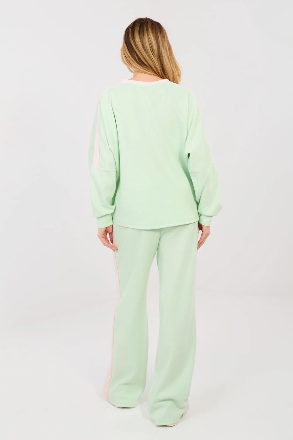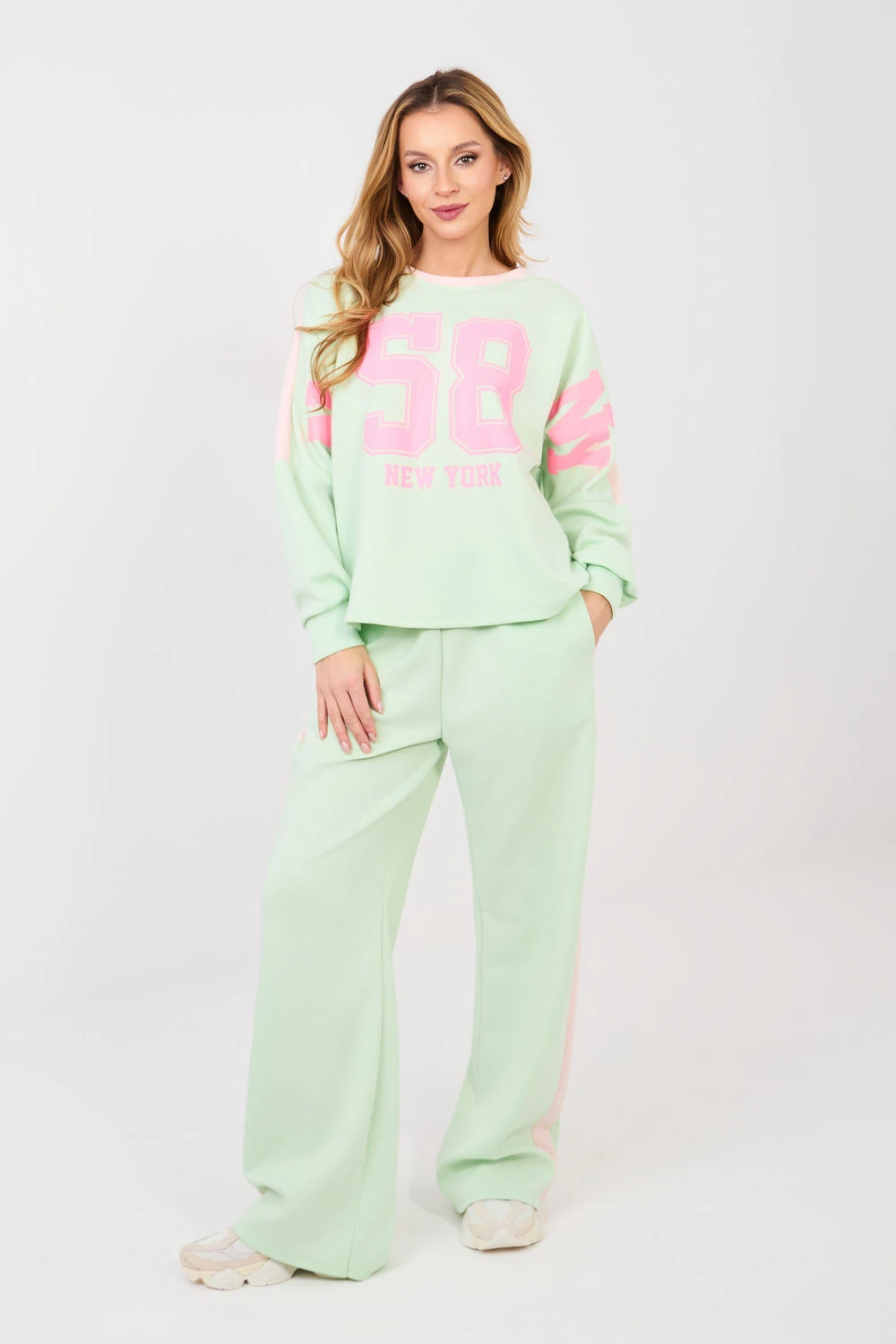 Dámský teplákový set skládající se z mikiny a kalhot je pohodlnou a stylovou volbou pro každodenní outfit v ležérním stylu. Model se skvěle hodí jak na běžné nošení, tak na procházky nebo odpočinek, kombinuje módní vzhled s maximálním pohodlím nošení. Ozdobné nápisy a čísla umístěné na přední straně mikiny a na rukávech dodávají celkovému vzhledu sportovní a moderní charakter. Set je vyroben z vysoce kvalitní směsi polyesteru, viskózy a elastanu, což zaručuje měkkost, pružnost a dobrou přiléhavost k postavě. Mikina má dlouhý rukáv a klasický kulatý výstřih. Kalhoty s dlouhými, širokými nohavicemi a vysokým pasem zaručují pohodlí a volnost pohybů. Praktické boční kapsy zvyšují funkčnost setu. Další výhodou jsou pruhy na nohavicích a rukávech, které zdůrazňují sportovní styl a opticky zúžují postavu.