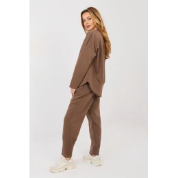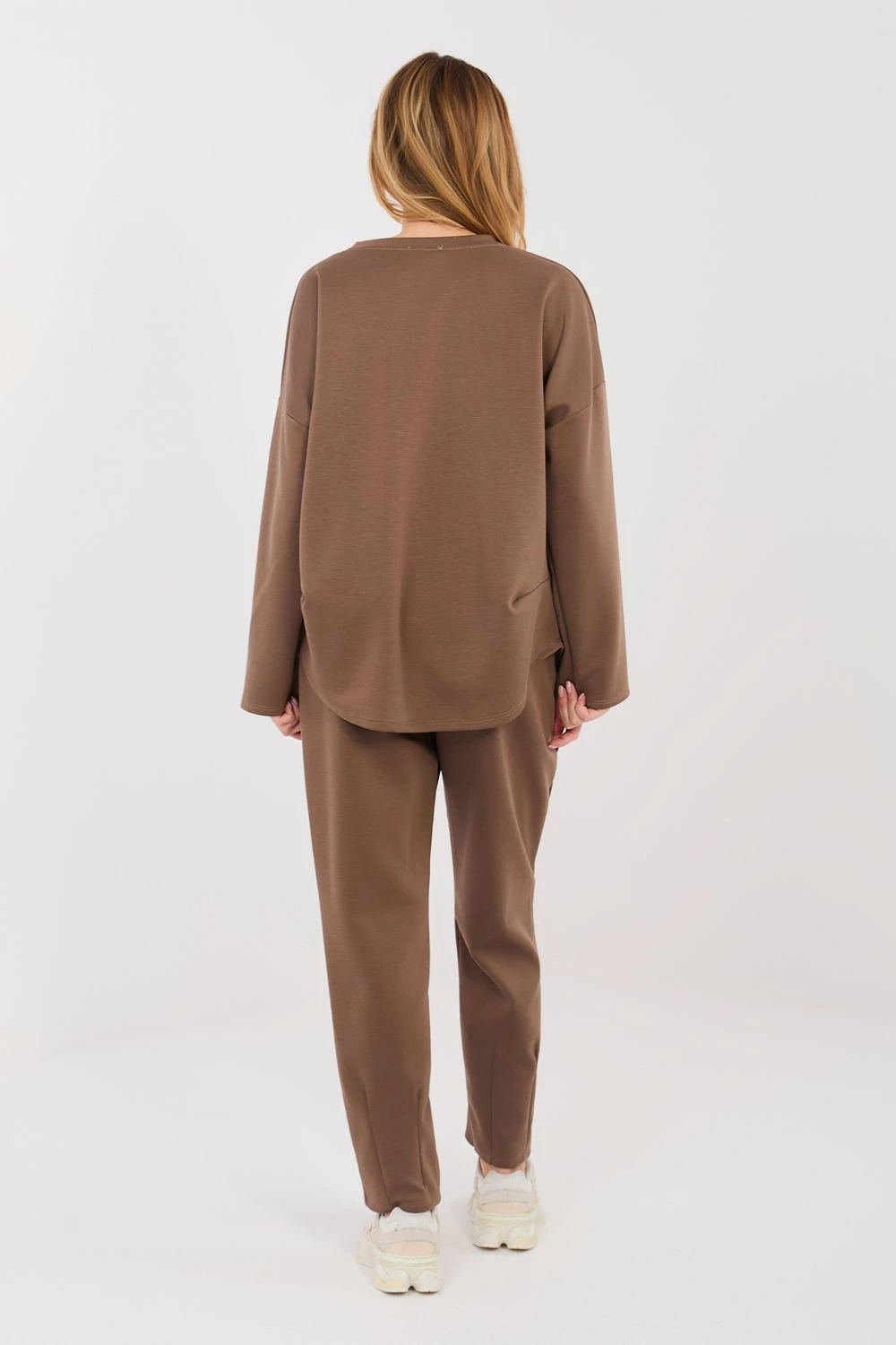 Dámský dresový set skládající se z mikiny a kalhot je ideální volbou pro každodenní outfit v casual stylu, kombinující pohodlí s minimalistickým designem. Hladký střih dělá set univerzálním a skvěle se hodí jak do domácího prostředí, tak i na vycházky do města či procházky. Set je vyroben z vysoce kvalitní směsi polyesteru, viskózy a elastanu. Materiál typu "máslo" je neuvěřitelně měkký, jemný a velmi příjemný na dotek, poskytující maximální pohodlí při nošení. Mikina s dlouhým rukávem a klasickým kulatým výstřihem má decentní nášivku umístěnou dole vpředu vlevo, která dodává celku moderní nádech. Kalhoty s dlouhou délkou a se zužujícími se nohavicemi se skvěle přizpůsobí postavě. Vysoký pas a šňůrky ke stažení v pase umožňují ideální přizpůsobení, a boční kapsy zvyšují funkčnost setu.
