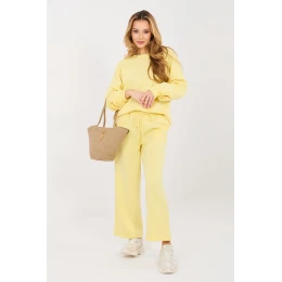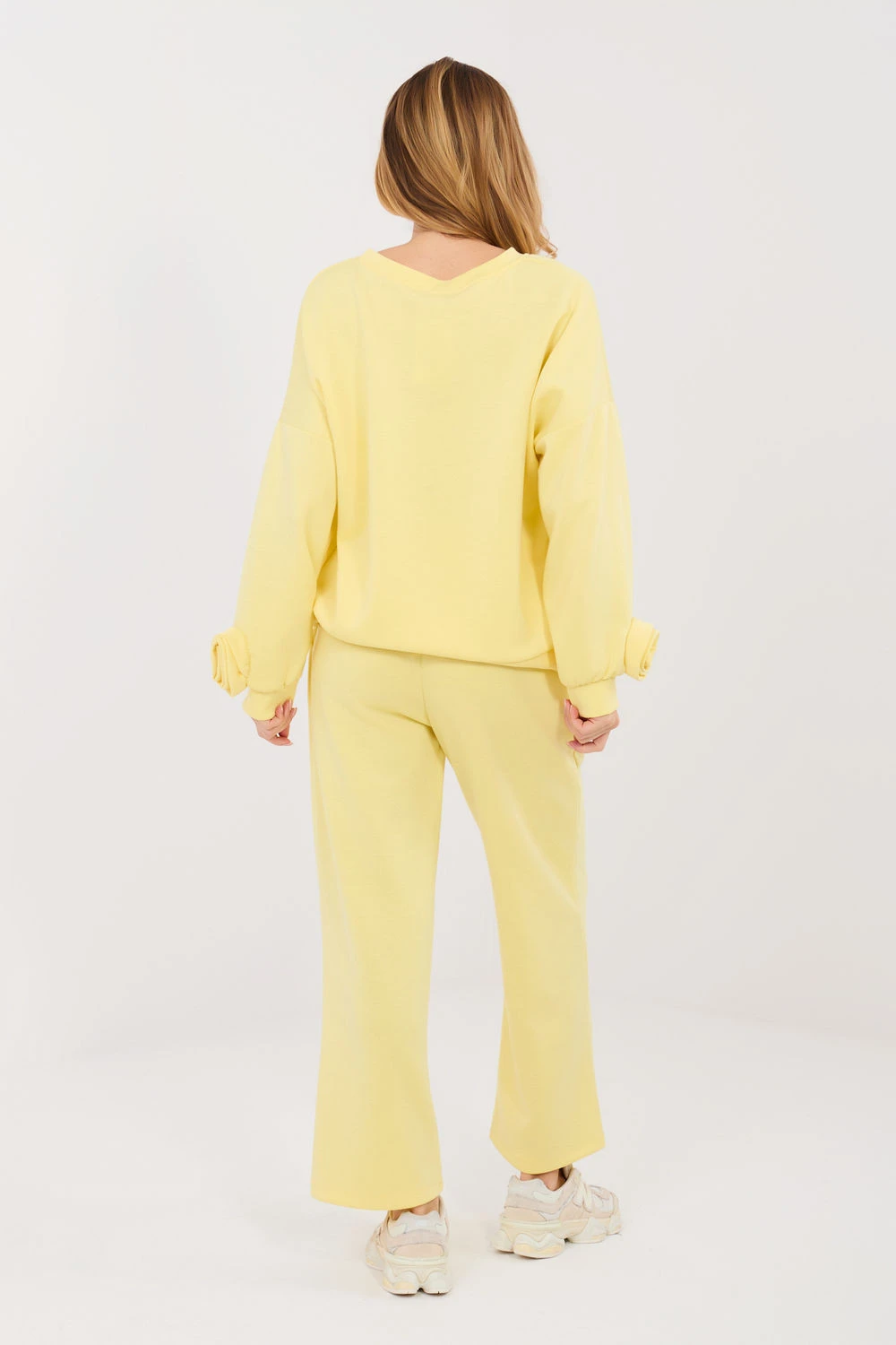 Elegantní dámský set skládající se z mikiny a kalhot, ideální pro každodenní volnočasový styl. Vyrobený z měkké a příjemné viskózy s přídavkem elastanu, který zajišťuje pohodlí a volnost pohybu po celý den. Mikina s dlouhým rukávem má kulatý výstřih a je zdobená jemnou látkovou růží na zápěstí, která dodává celku ženský a originální charakter. Kalhoty s vysokým pasem a rovnými nohavicemi zaručují pohodlí a nadčasový vzhled. V pasu mají vsazenou gumu a šňůrky k přivázání, což umožňuje ideální přizpůsobení postavě. Další výhodou jsou boční kapsy, které zvyšují funkčnost setu. Hladký vzor dělá set univerzálním a snadno stylizovatelným, skvělý jak na procházky, tak do každodenního života. Je to nabídka pro ženy, které oceňují pohodlí, styl a decentní detaily.