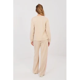 Tato dámská souprava se skládá z mikiny a kalhot a je ideální nabídkou pro ženy na každý den, které oceňují pohodlí, volnost pohybu a módní, ležérní styl. Měkký materiál typu flanel je neuvěřitelně jemný a příjemný na dotek, díky čemuž se souprava skvěle hodí jak pro domácí relaxaci, tak pro každodenní vycházky. Mikina s dlouhým rukávem s pruhem byla zdobena decentním motivem srdíček na přední straně, který dodává celku ženský a dívčí charakter. Široké nohavice kalhot s módními pruhy opticky zúží postavu, a vysoký pas krásně zdůrazní pas a zajistí pohodlí nošení. Nastavitelný pas s šňůrkami umožňuje ideální přizpůsobení a boční kapsy zvyšují funkčnost setu. Tato dámská souprava spojuje pohodlí s módním vzhledem. Ideální na procházky, nakupování, cestování či lenivé dny doma vždy, když chcete být pohodlně oblečeni a stylově zároveň.